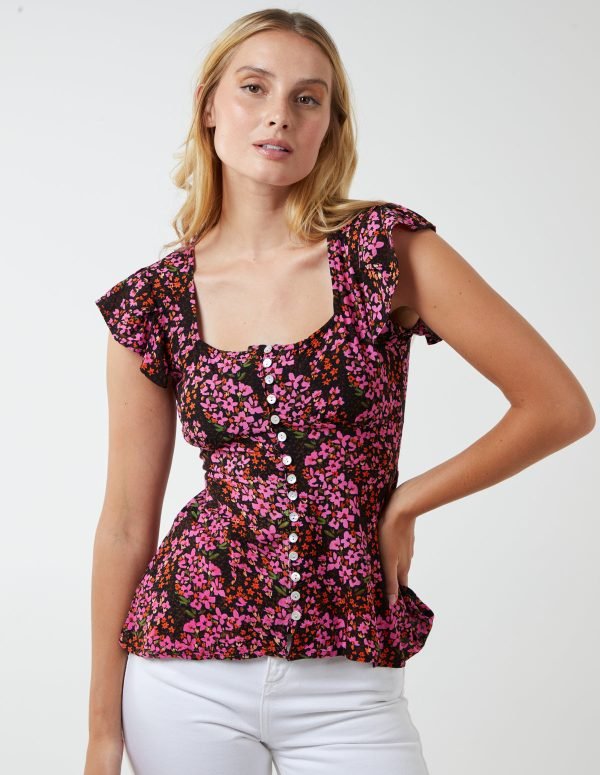 Milkmaid Button Front Floral Peplum Top
