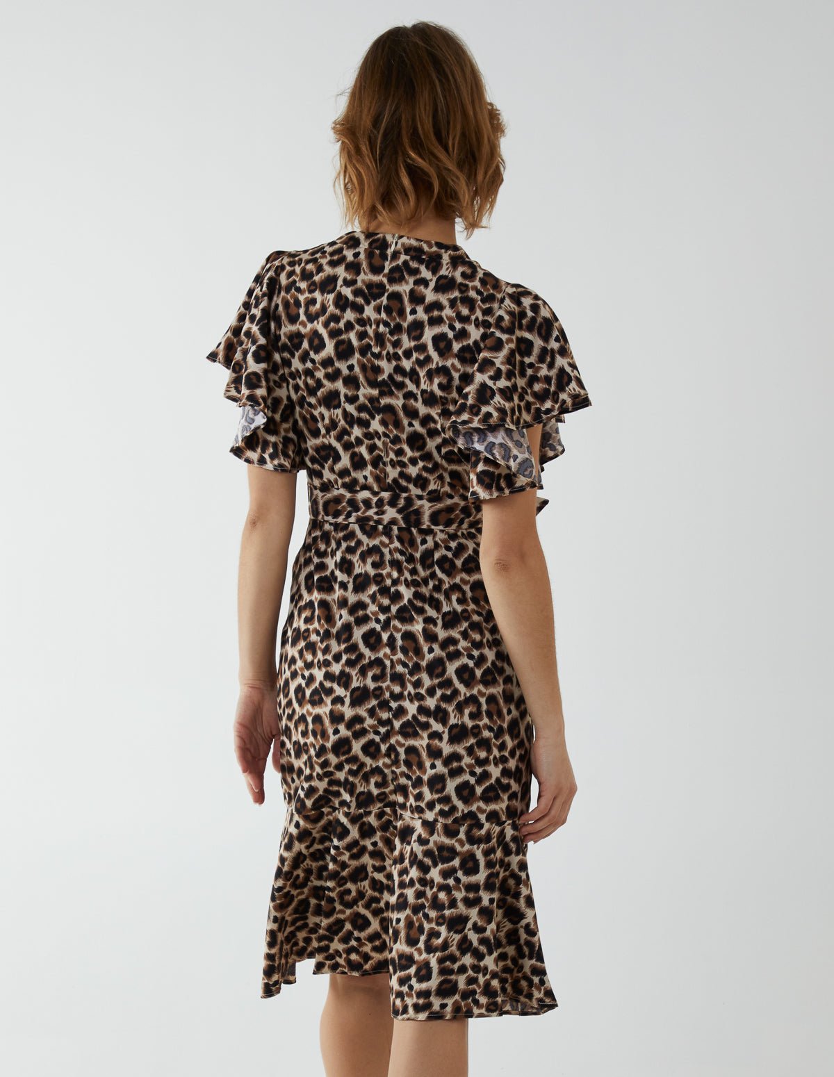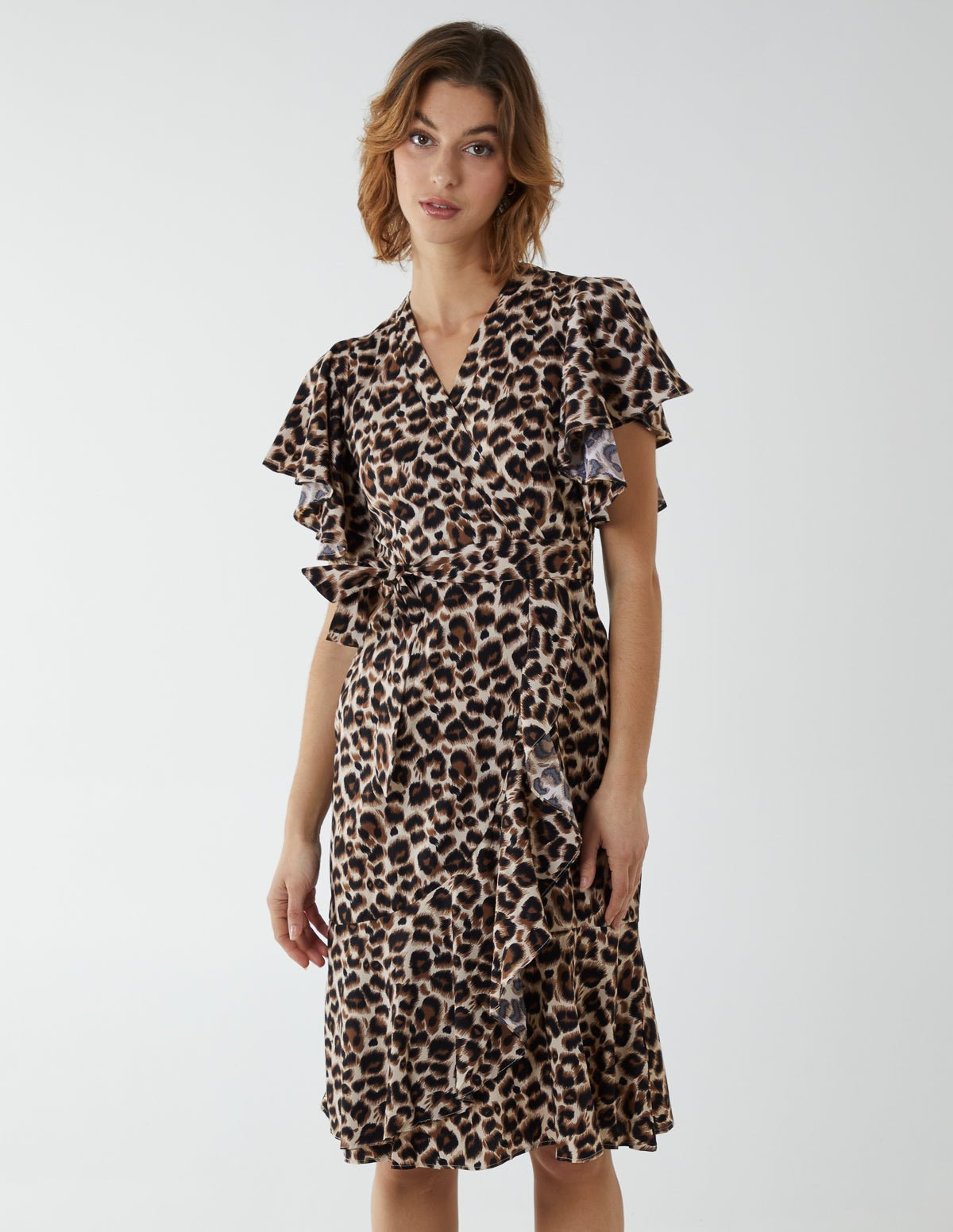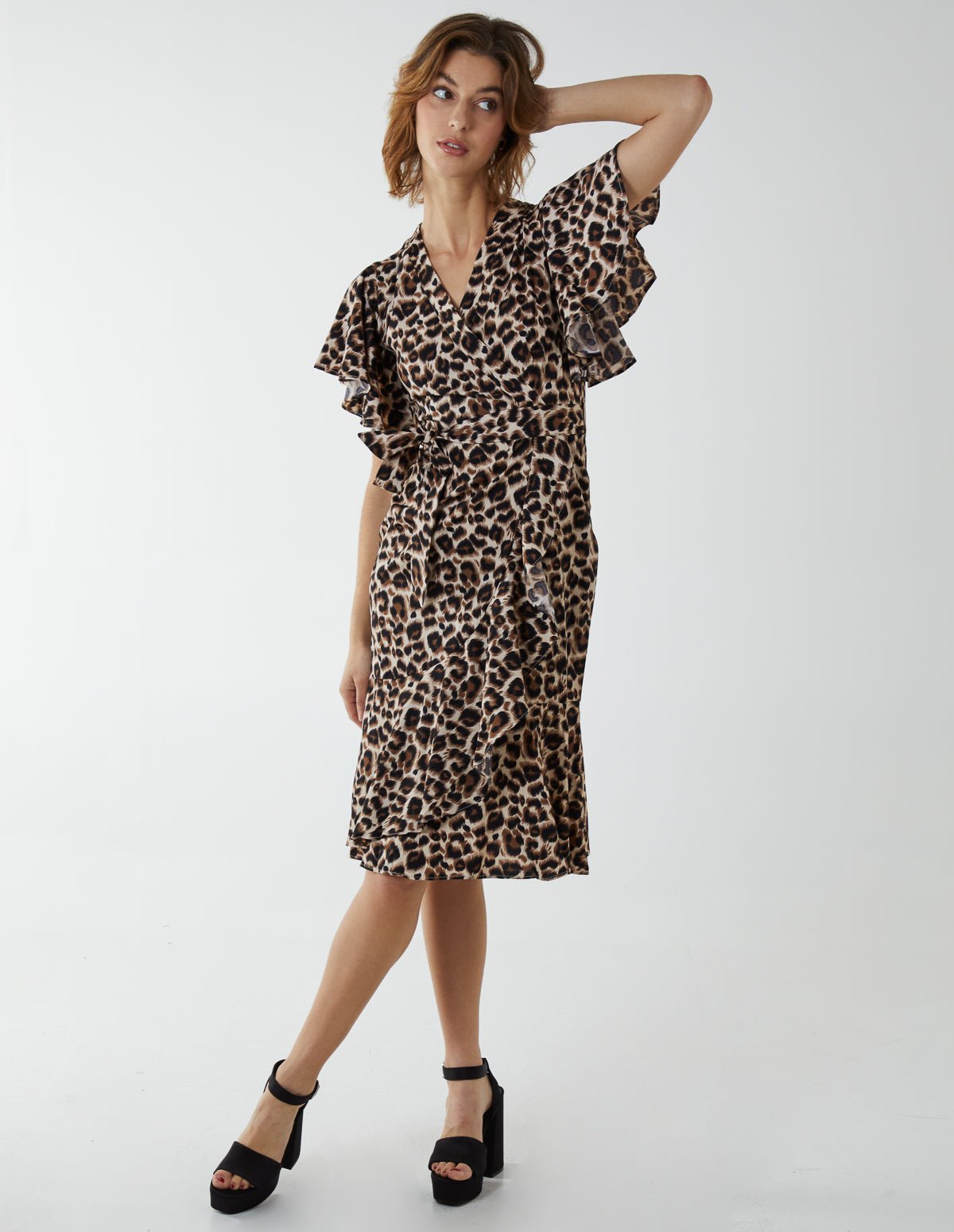 Make a statement this season with this leopard print dress! With a wrap front, tie waist and frill sleeves that add a refined element to the dress, complete your look by matching with wedge shoes.