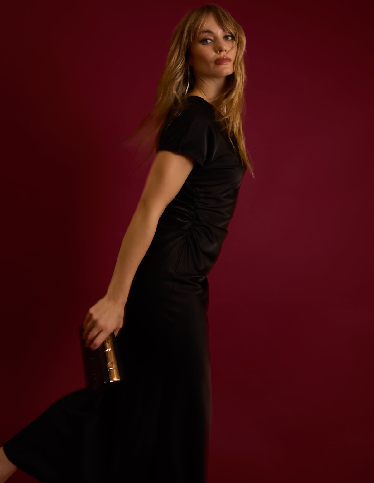 Make sure you’re the best-dressed guest with this gorgeous black satin slip dress. Teamed with gold heels and accessories, you can’t go wrong with this little number.