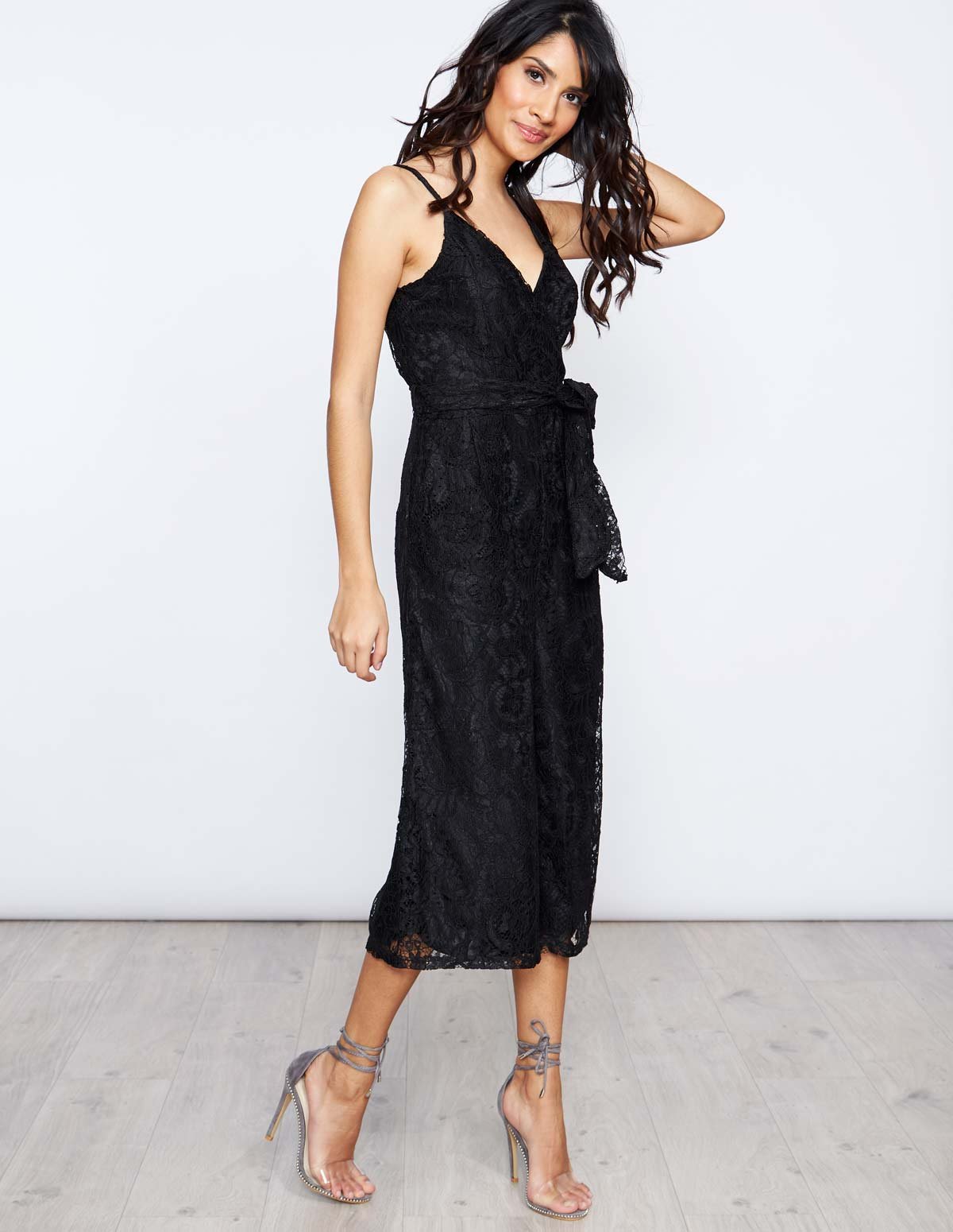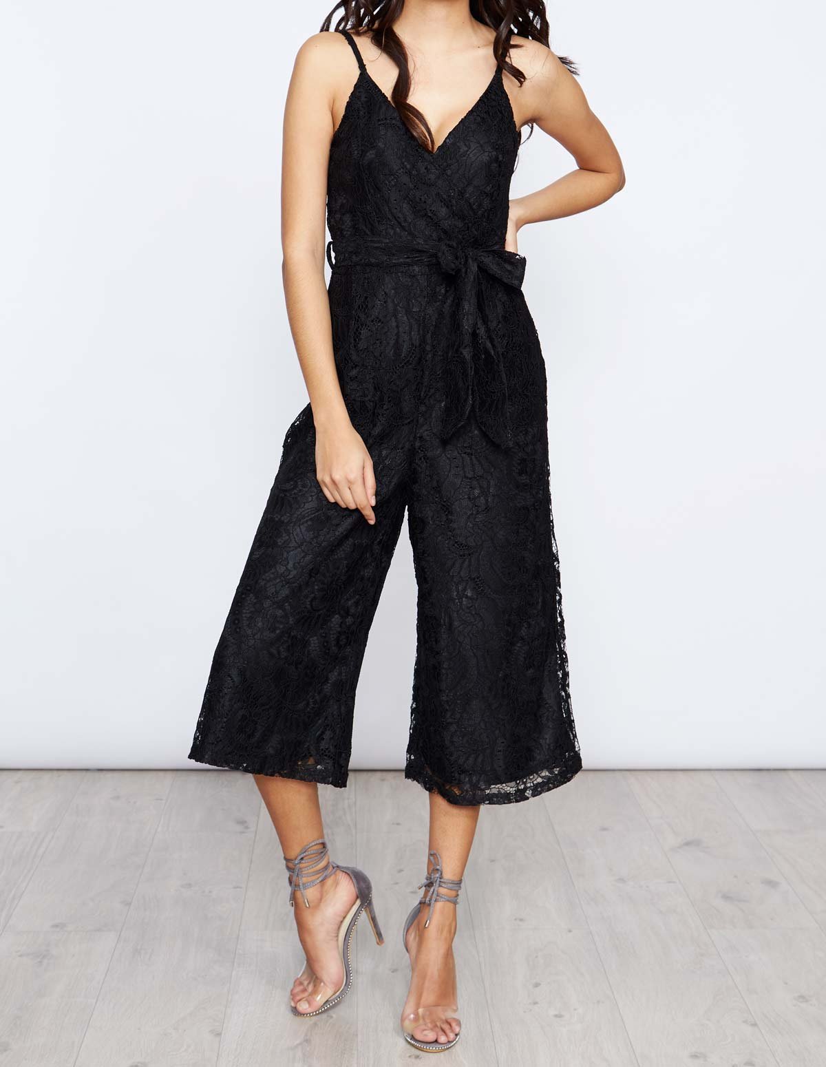 Make a statement in this jumpsuit girl. Featuring a black lace fabric, work with strappy heels for a weekend style that will have all eyes on you.