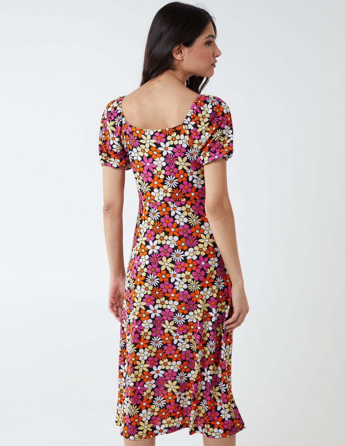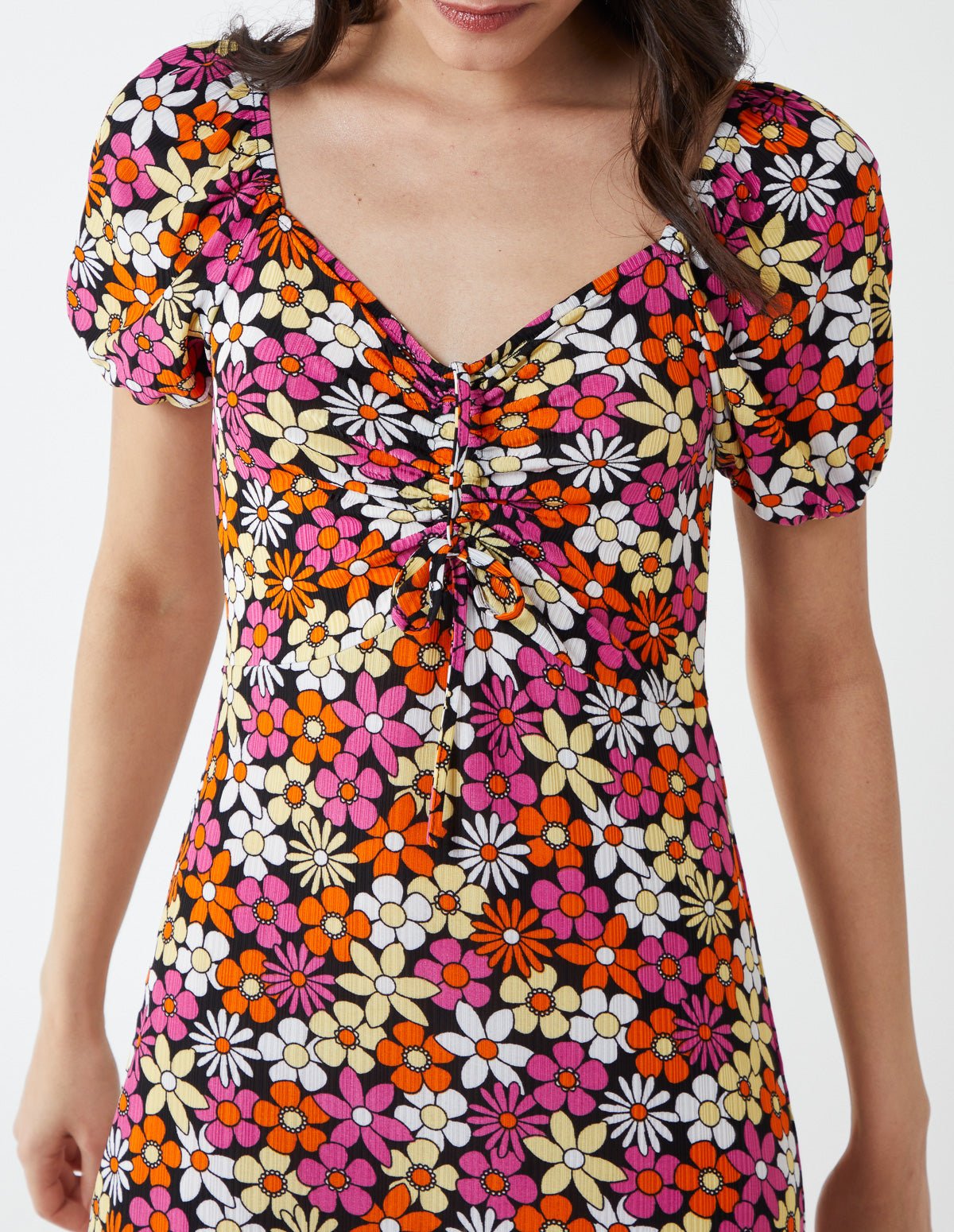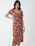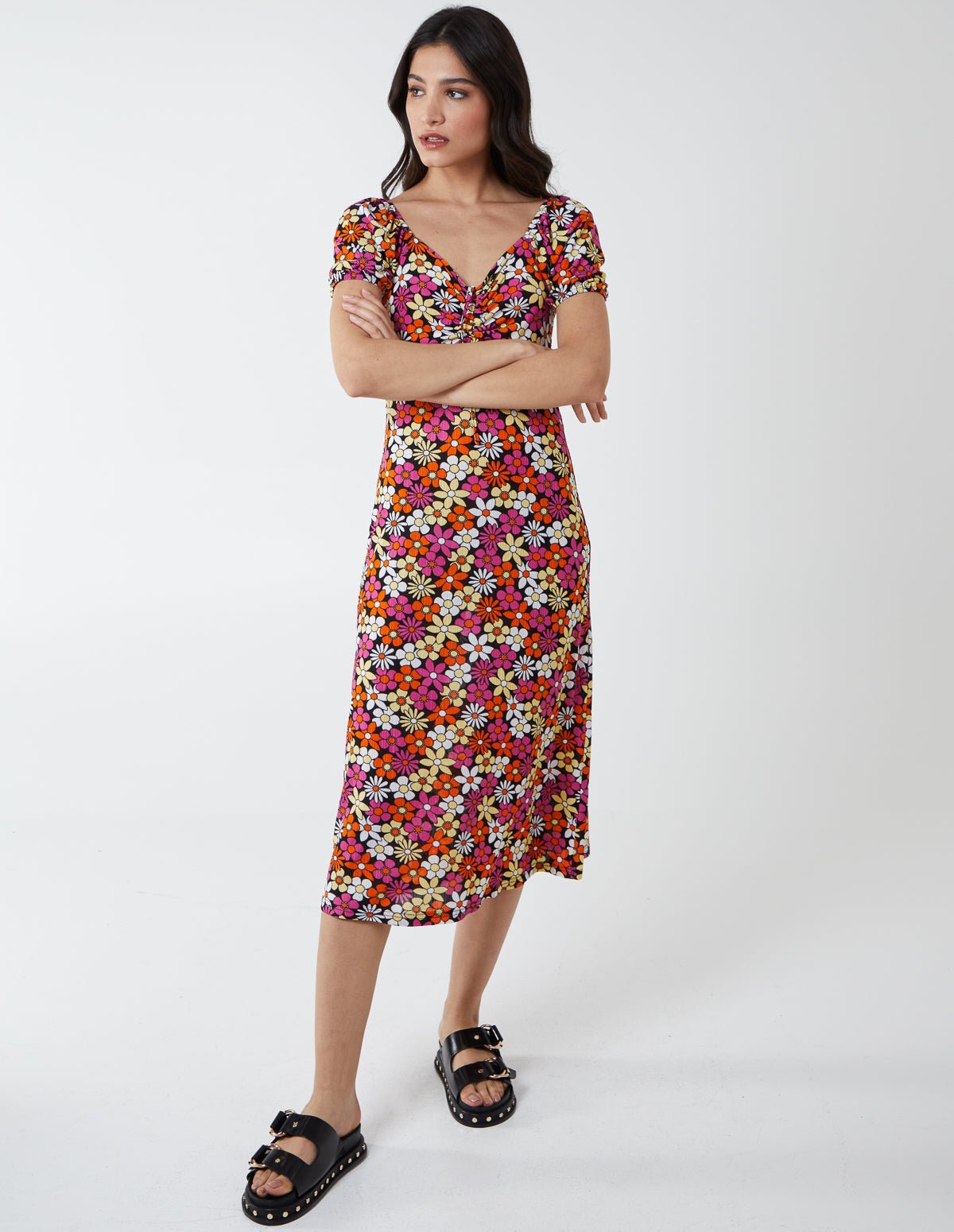 Bring some summer florals into your wardrobe with this beautiful lightweight midi dress! This ruched front swing dress will help to discover your femine nature. Pair with sandals for a day time look.Â
