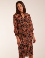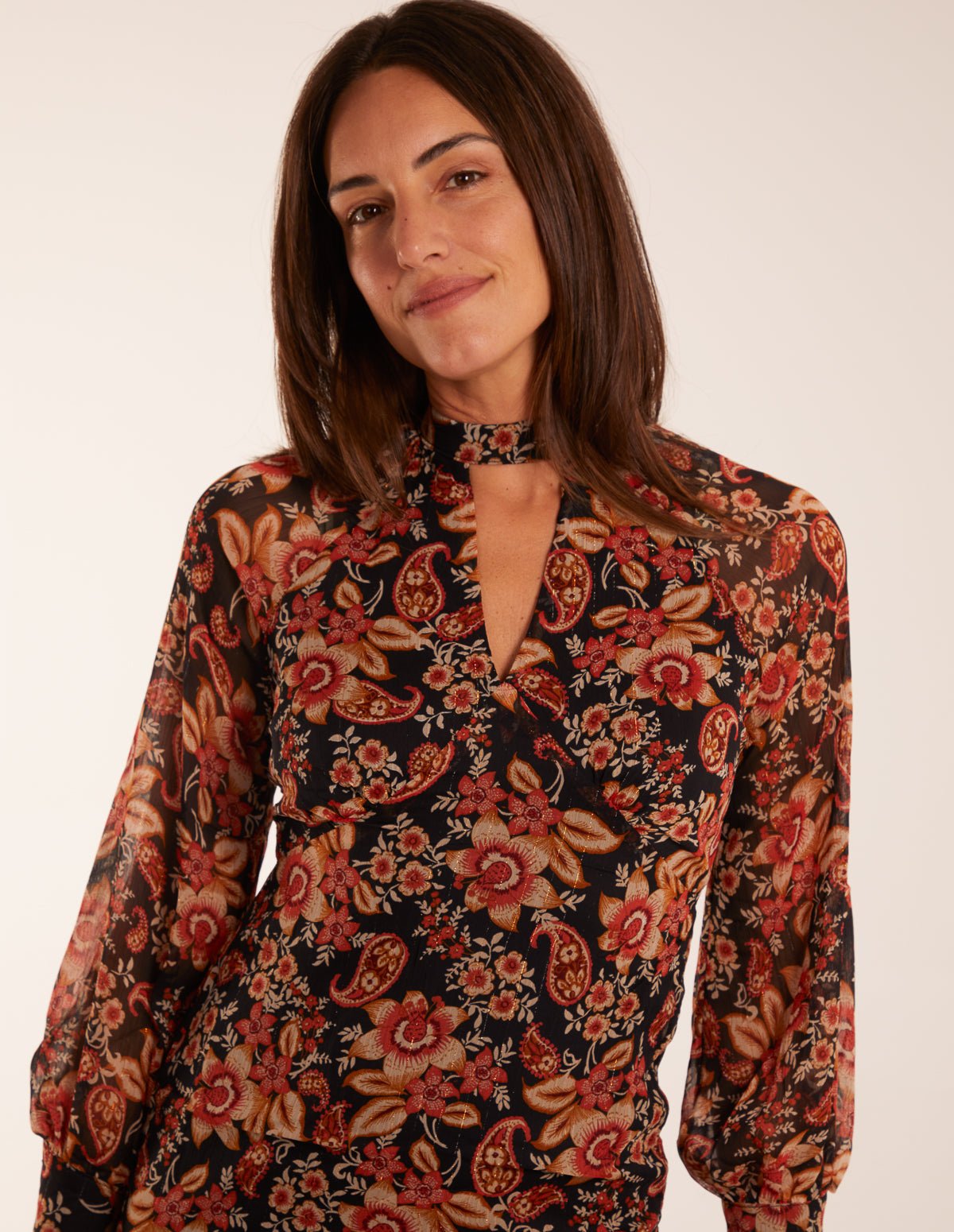 Here’s a pretty floral option for the colder days ahead! Team this high neck keyhole chiffon dress with tights and over the knee boots.