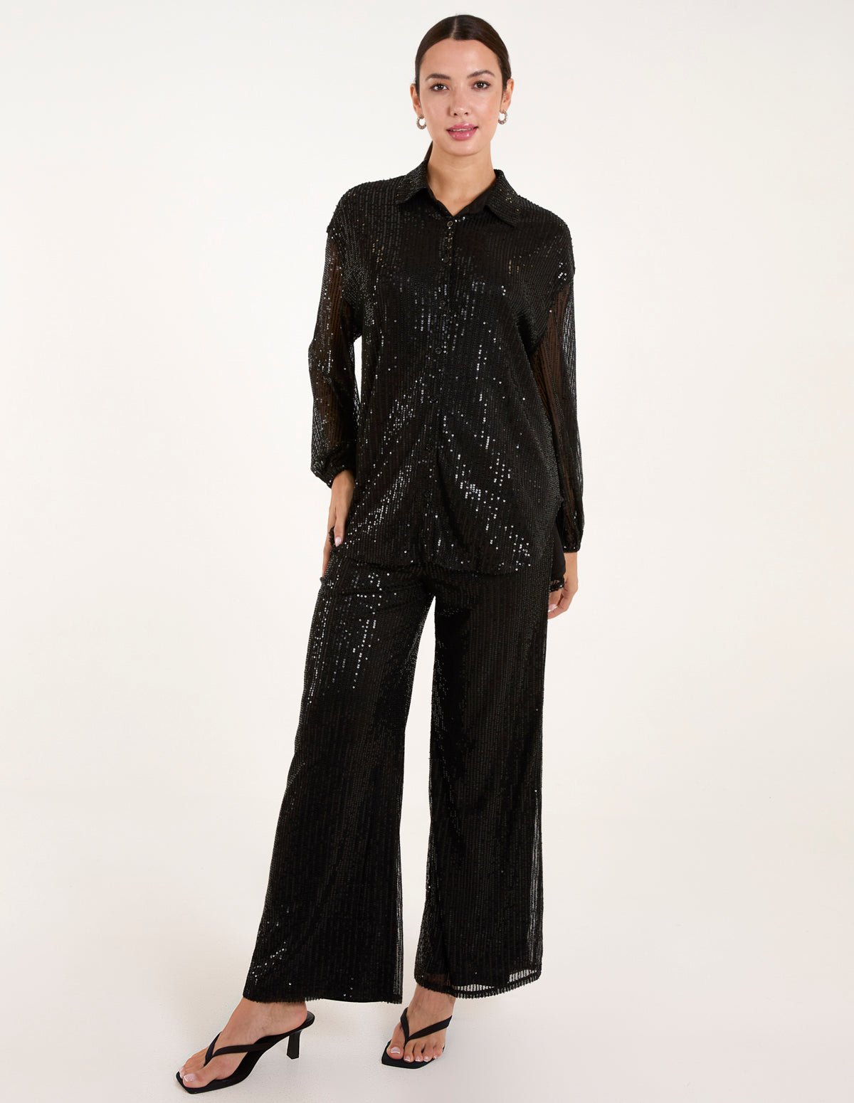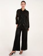 A new sparkly piece to add to your partywear collected. If you’re looking to dazzle the guests at an upcoming party, piece this sequin shirt with a formal wide leg trousers. And be sure to light up the room as much as the disco ball.