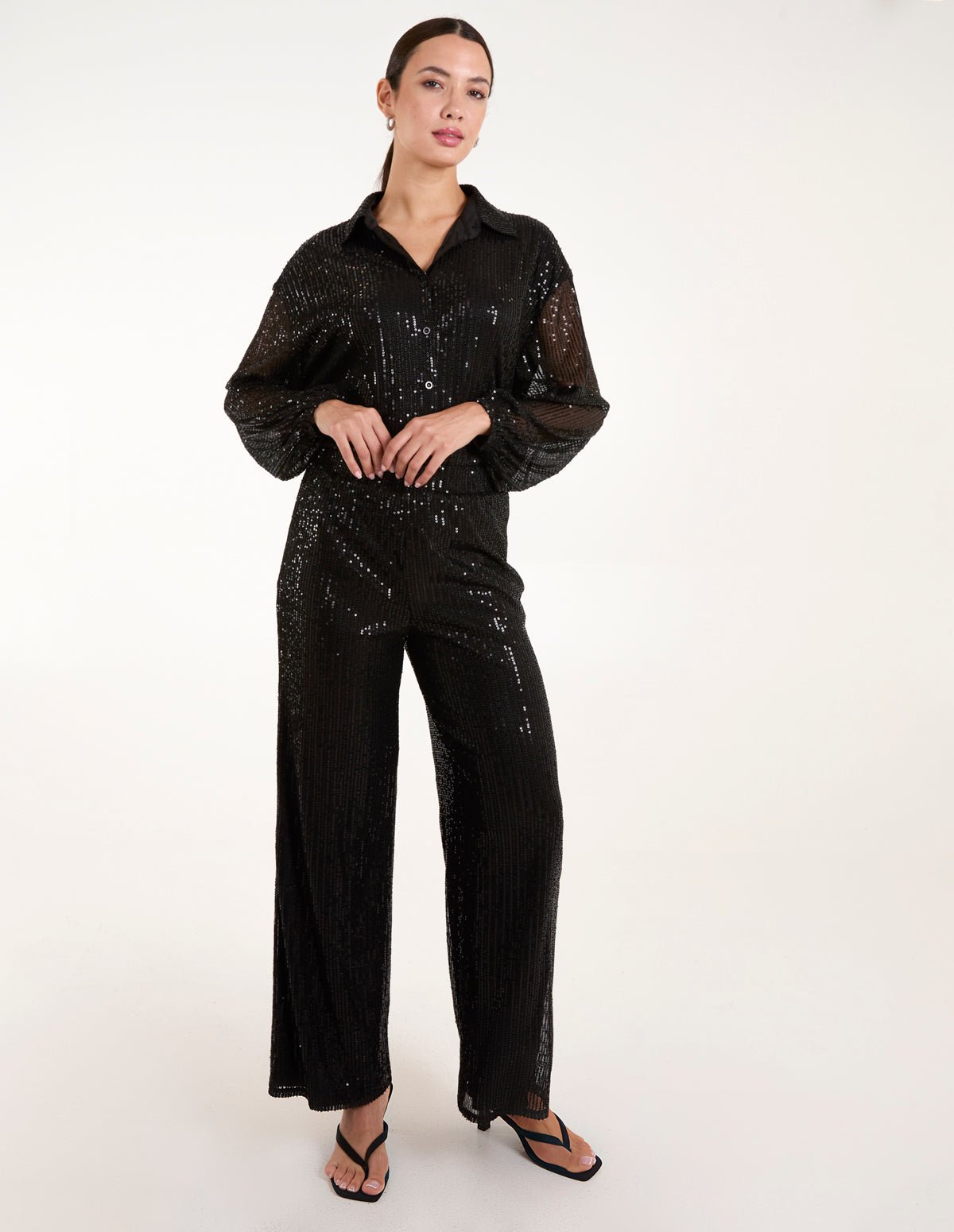 Born to boogie in style! These flared sequin trousers are super chic. Team with a sheer blouse and court heels and be sure to sparkle into the night.