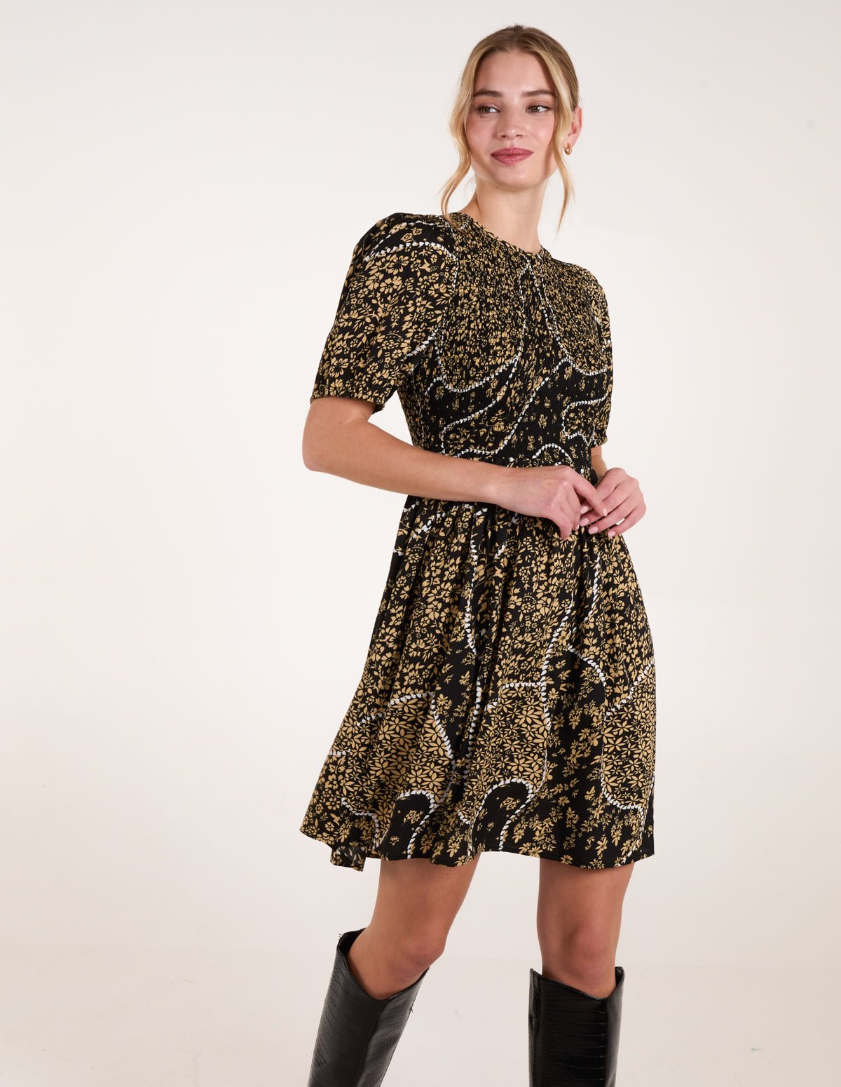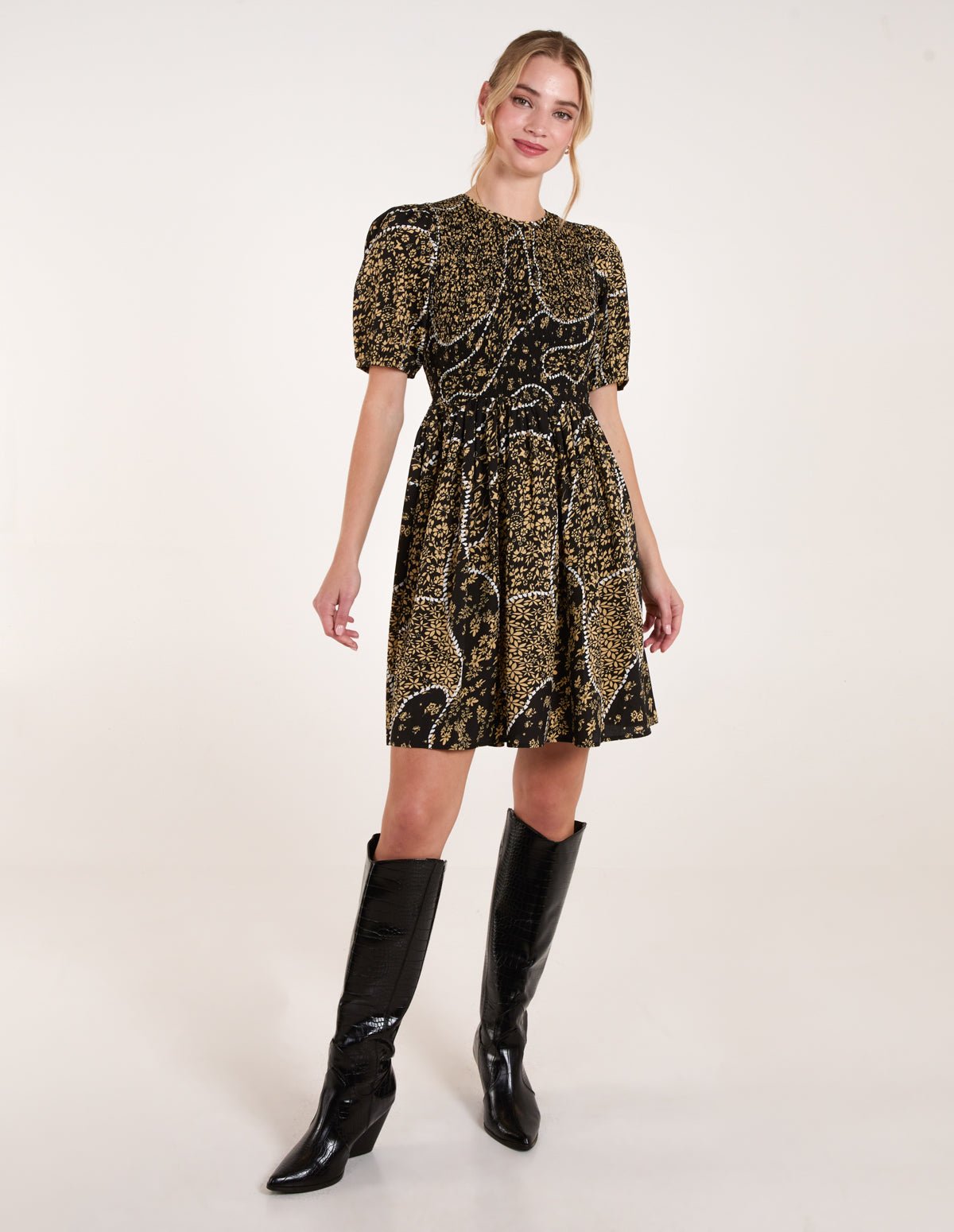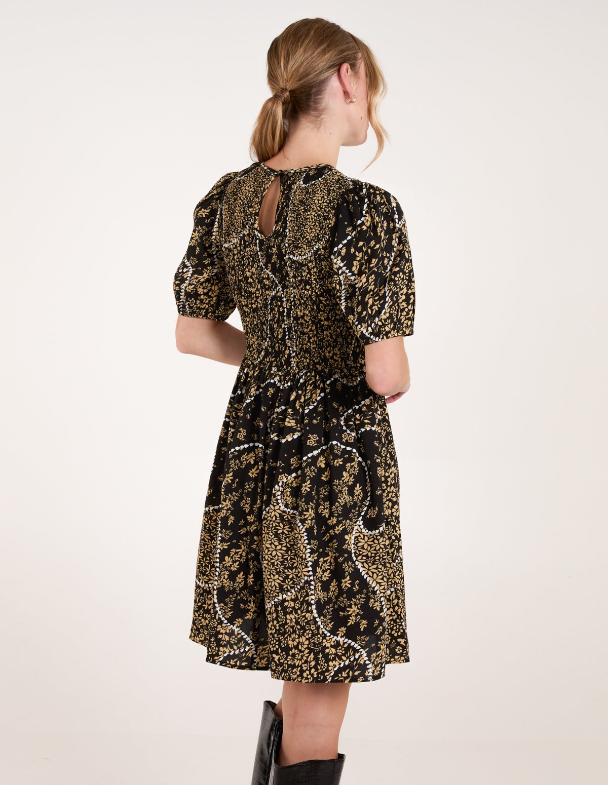 This elasticated shirred waist dress is a quick and easy option to wear to work. Team with tights and chunky boots.