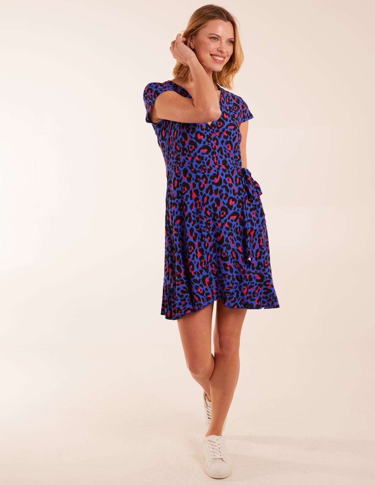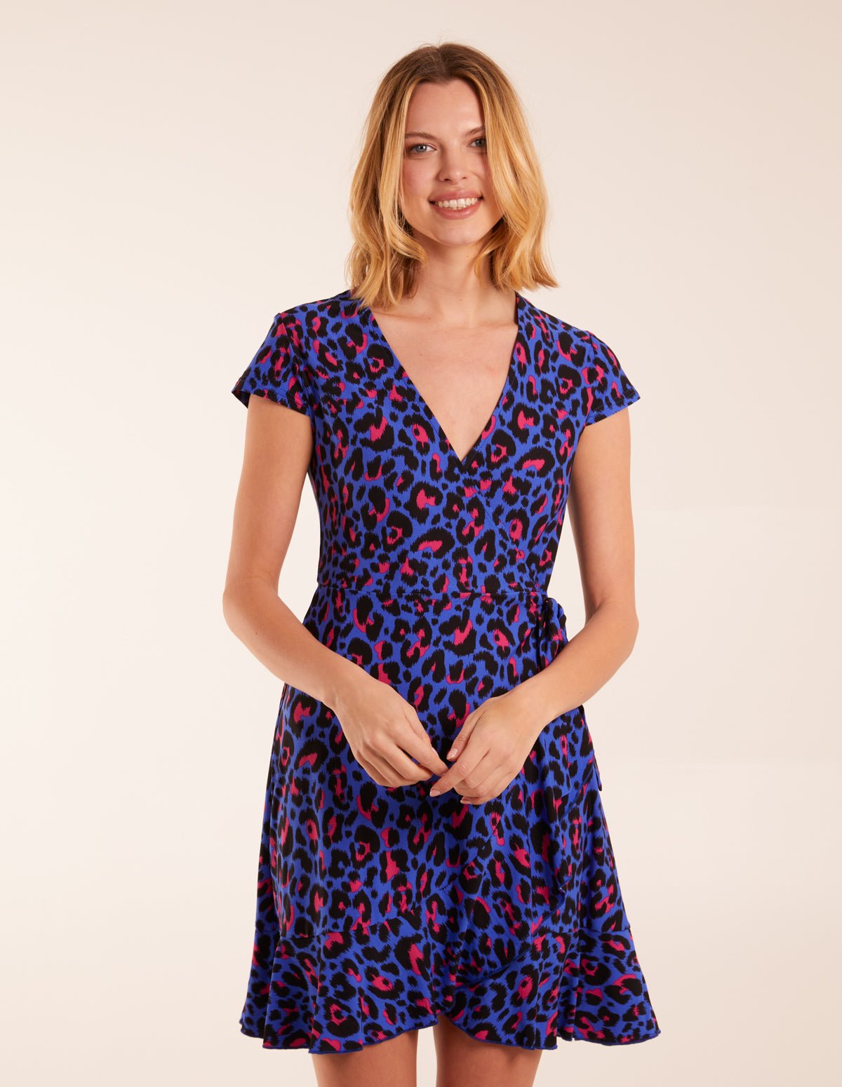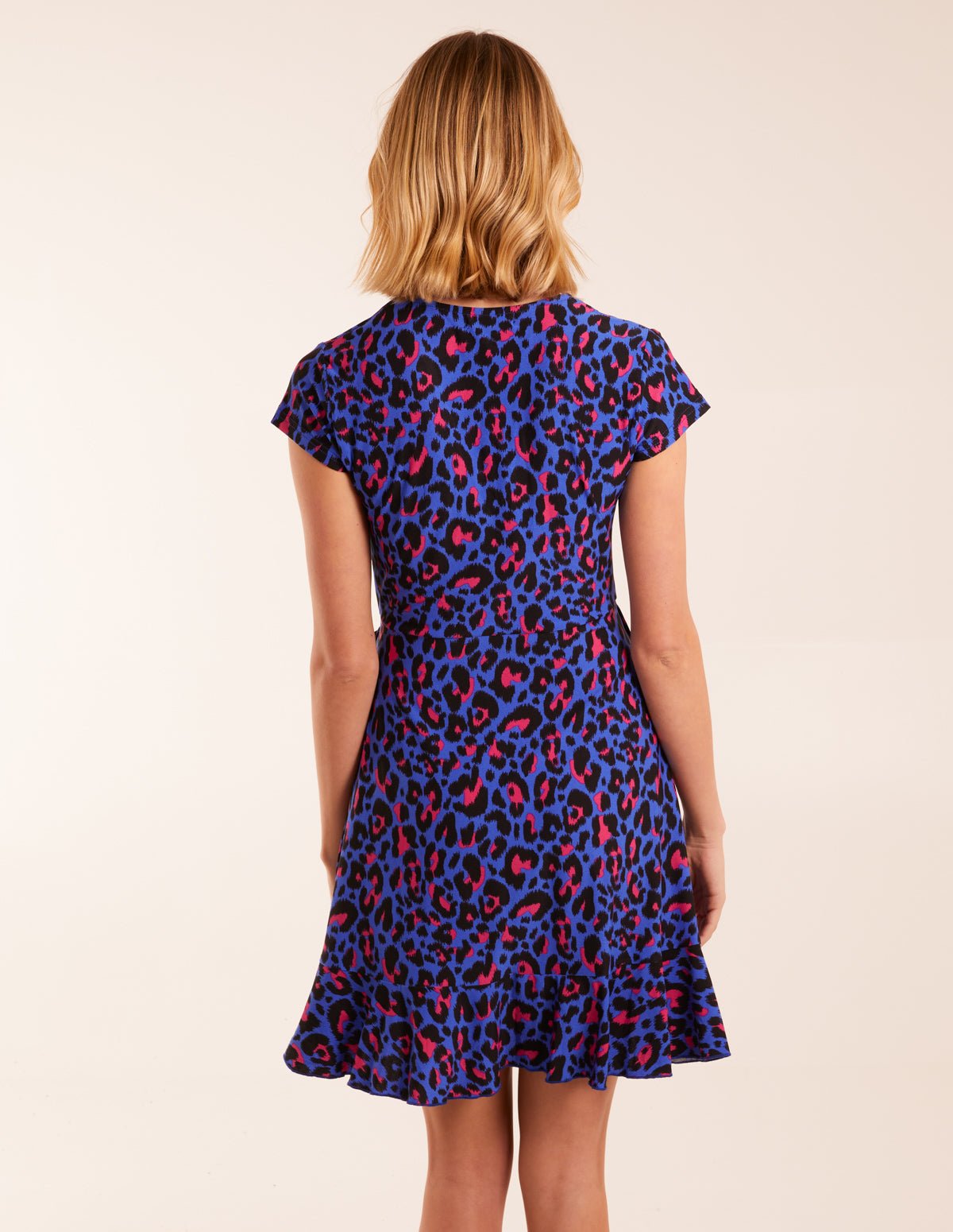 Our vibrant electric blue with black and pink snow leopard print wrap mini dress is a flattering and versatile style that is perfect for nailing your weekday and off-duty look at the switch of your shoes.