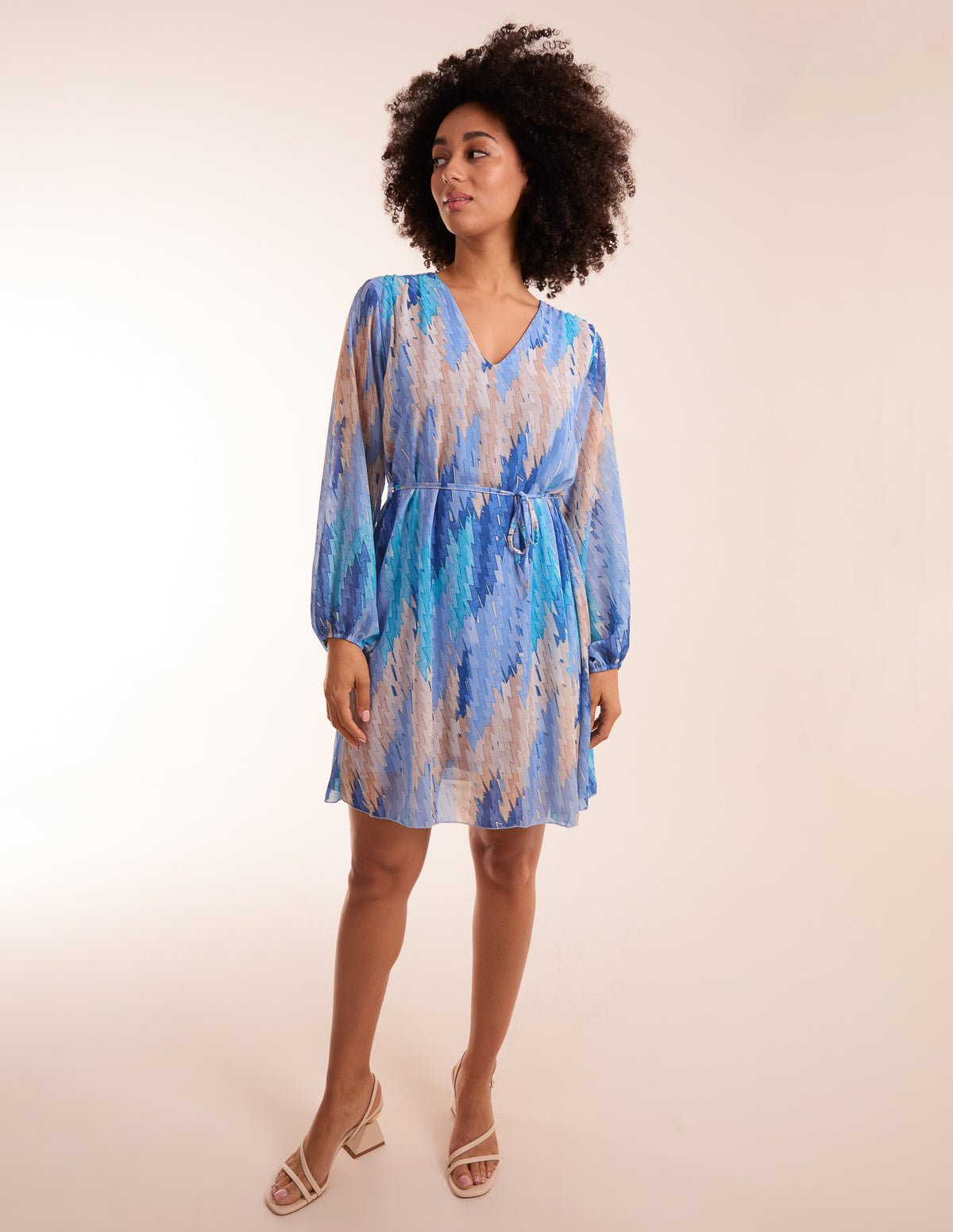 A wardrobe stunner, this belted mini dress is perfect for looking glamorous on any occasion. With a zig-zag print, belted waist and flowy skirt design. Accessorize with fine jewellery and heels for off off-duty look.