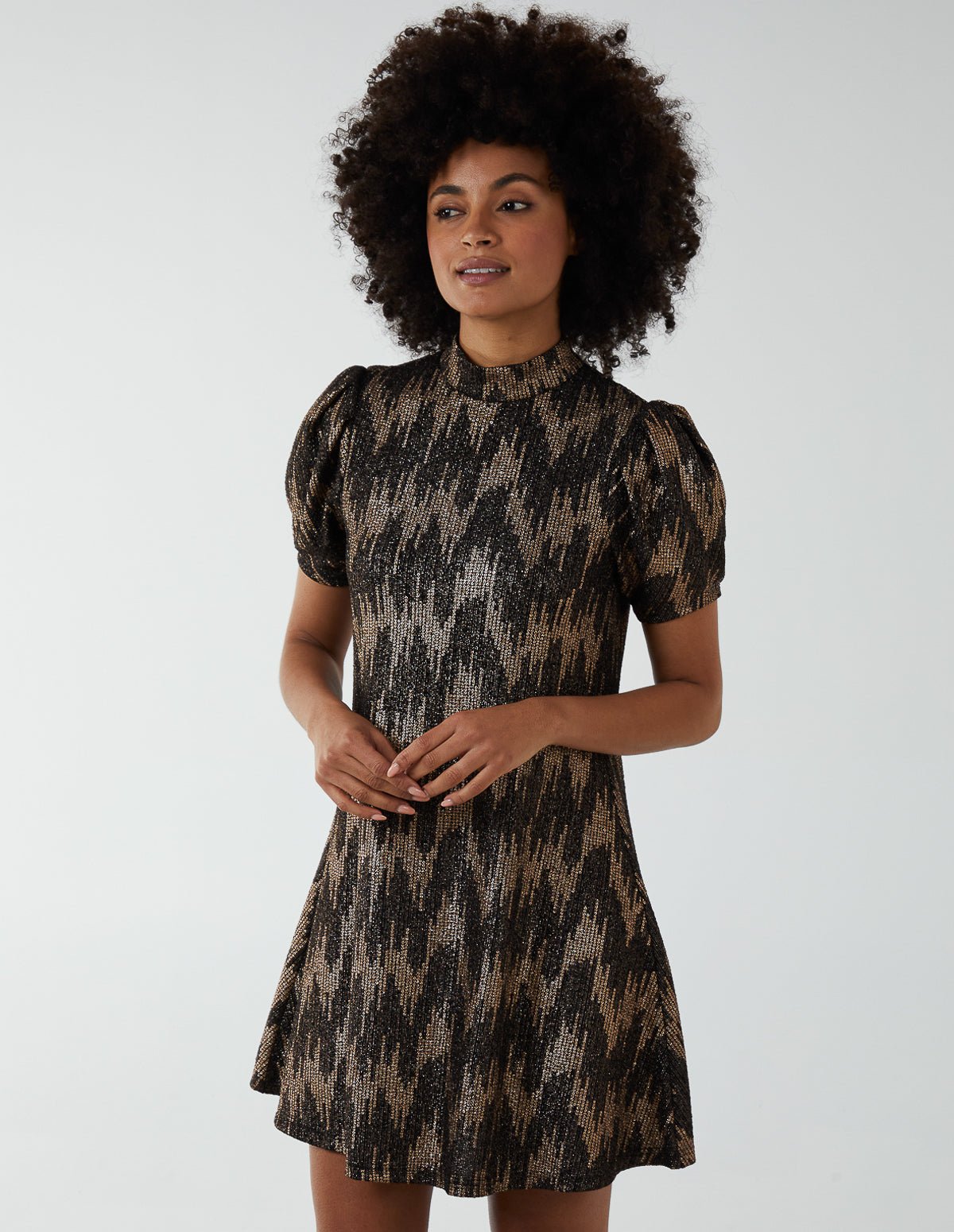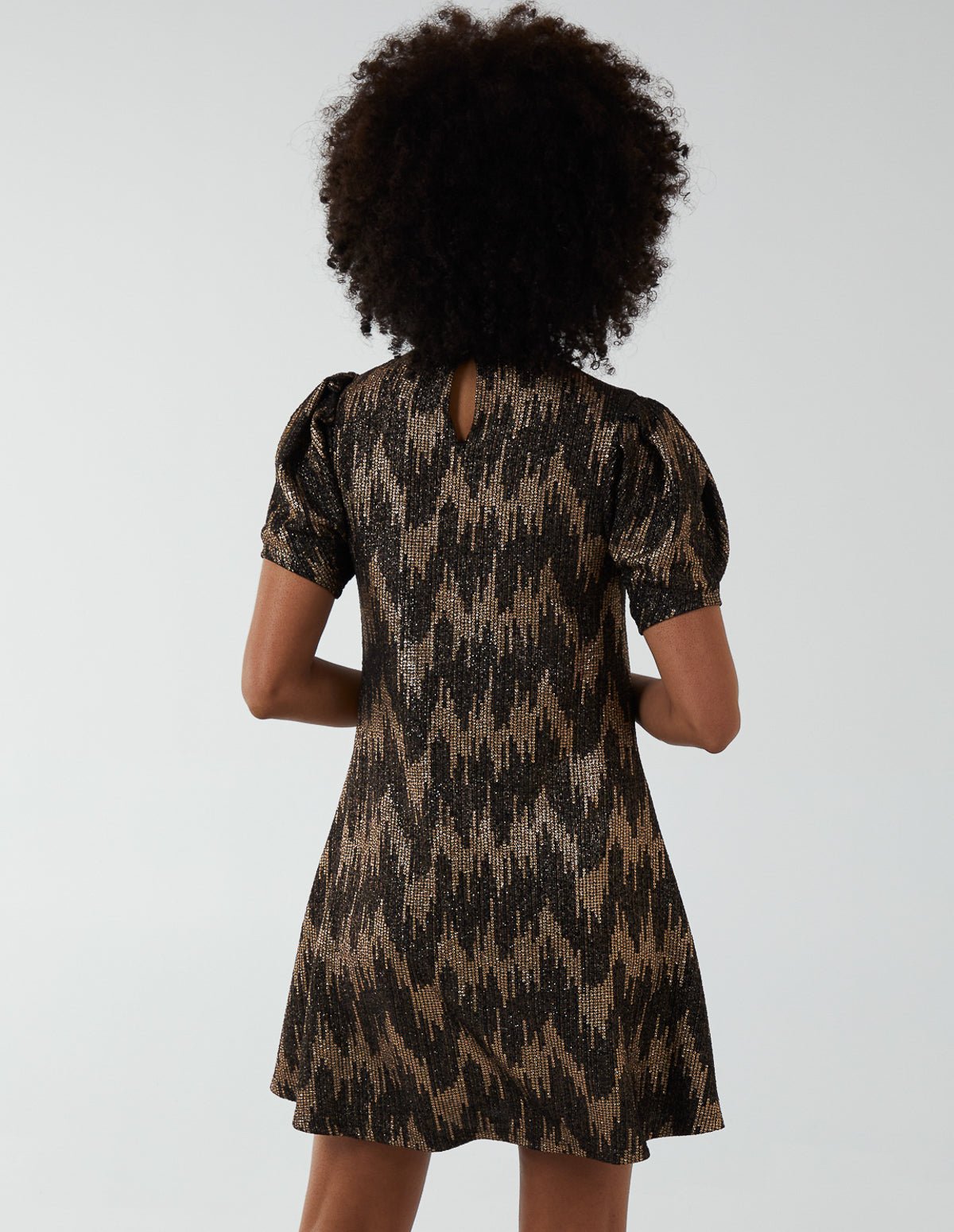 Foil Zig Zag Puff Sleeve Swing Dress