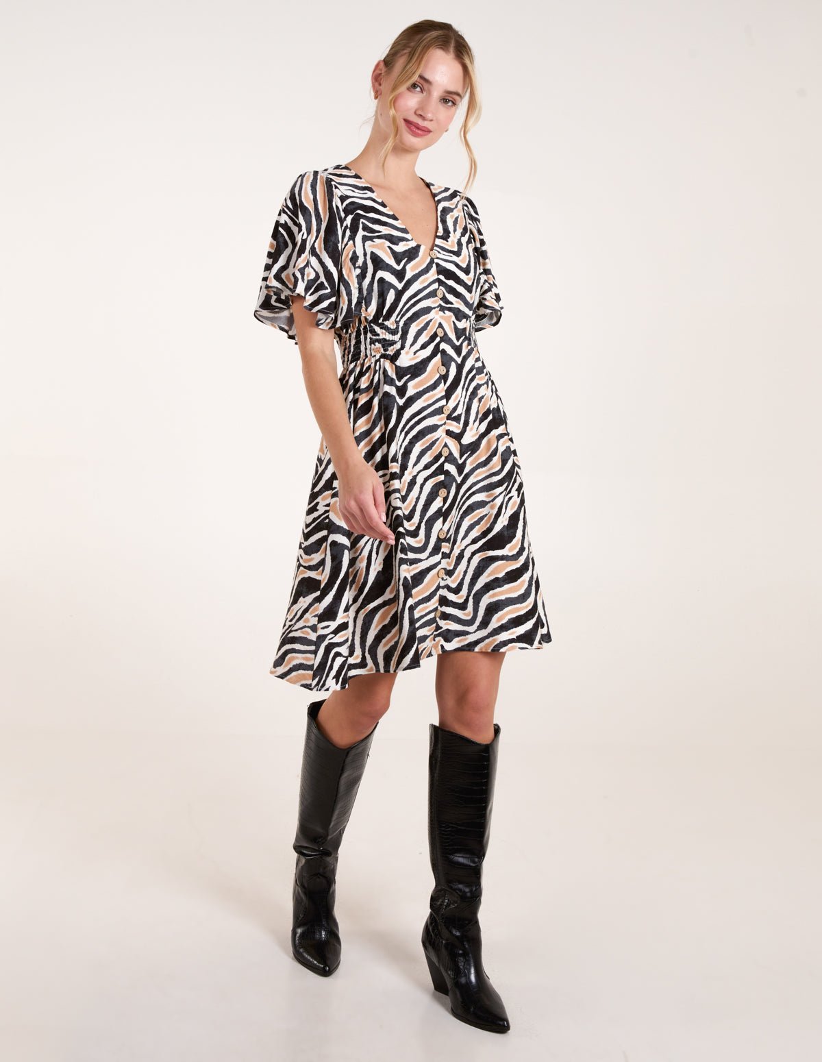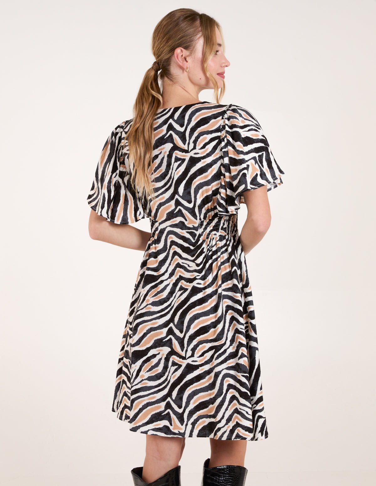Roar lots of compliments in this zebra printed dress! Adding a fun feel to your summer time wardrobe! Team with gladiator sandals.