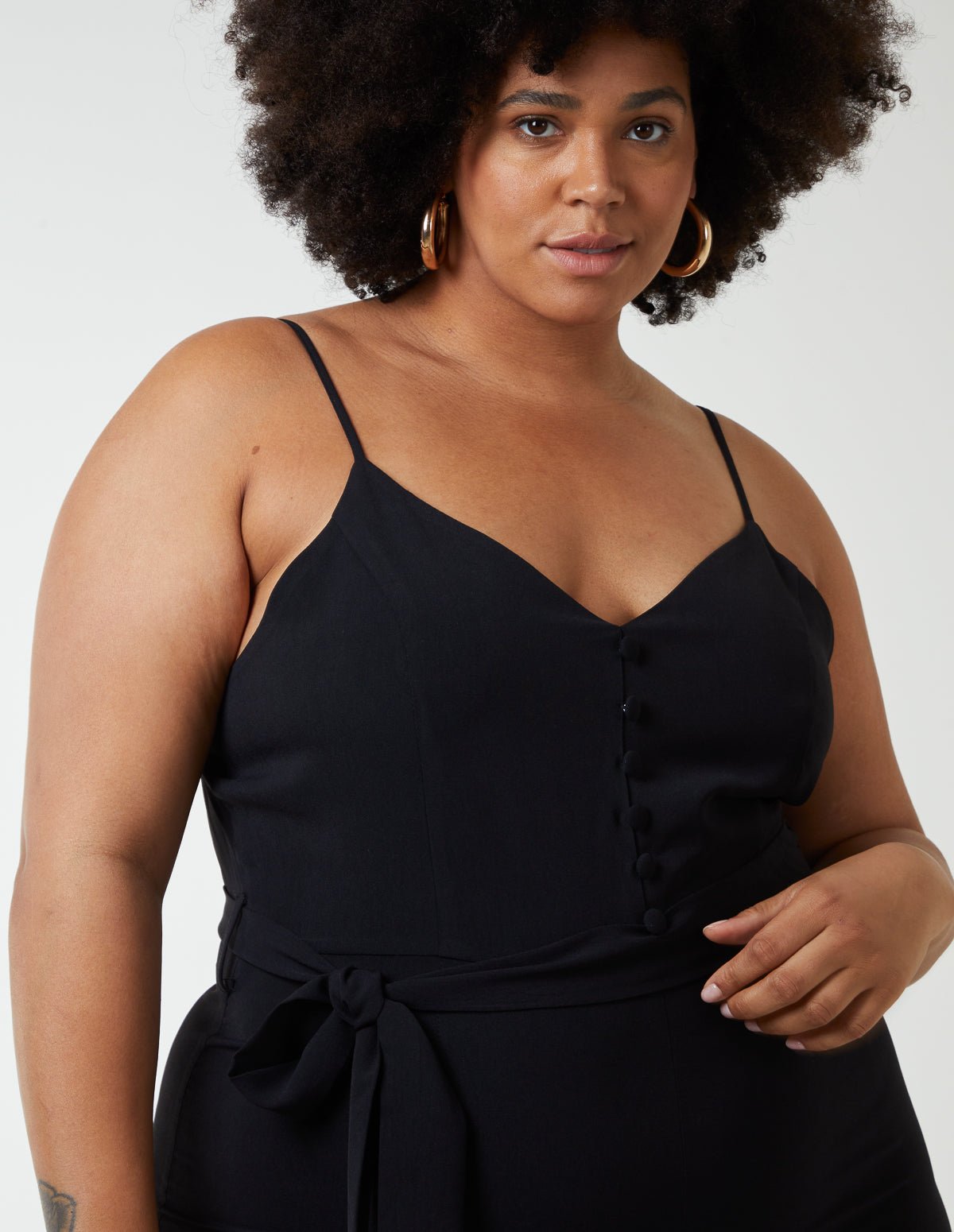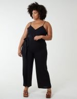 Our elegant jumpsuit is finished with a tie front waist, flattering shaped neckline and a decorative button front. An effortless choice for summer evenings out.