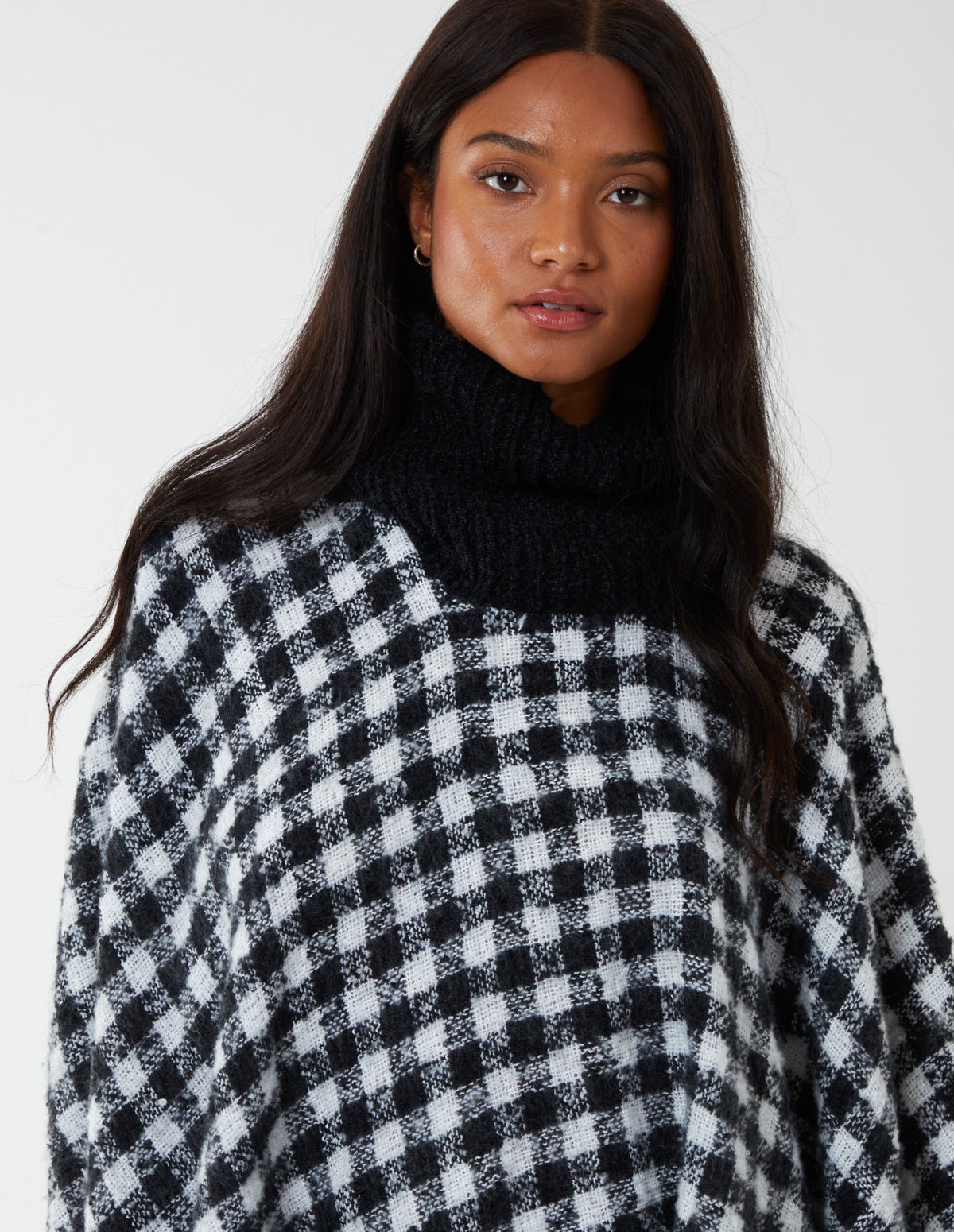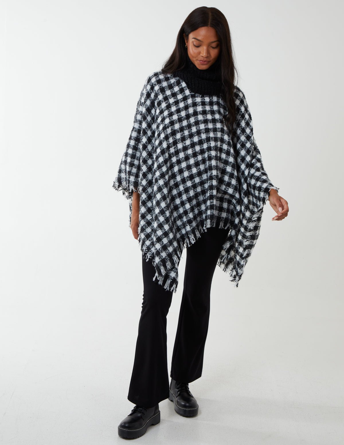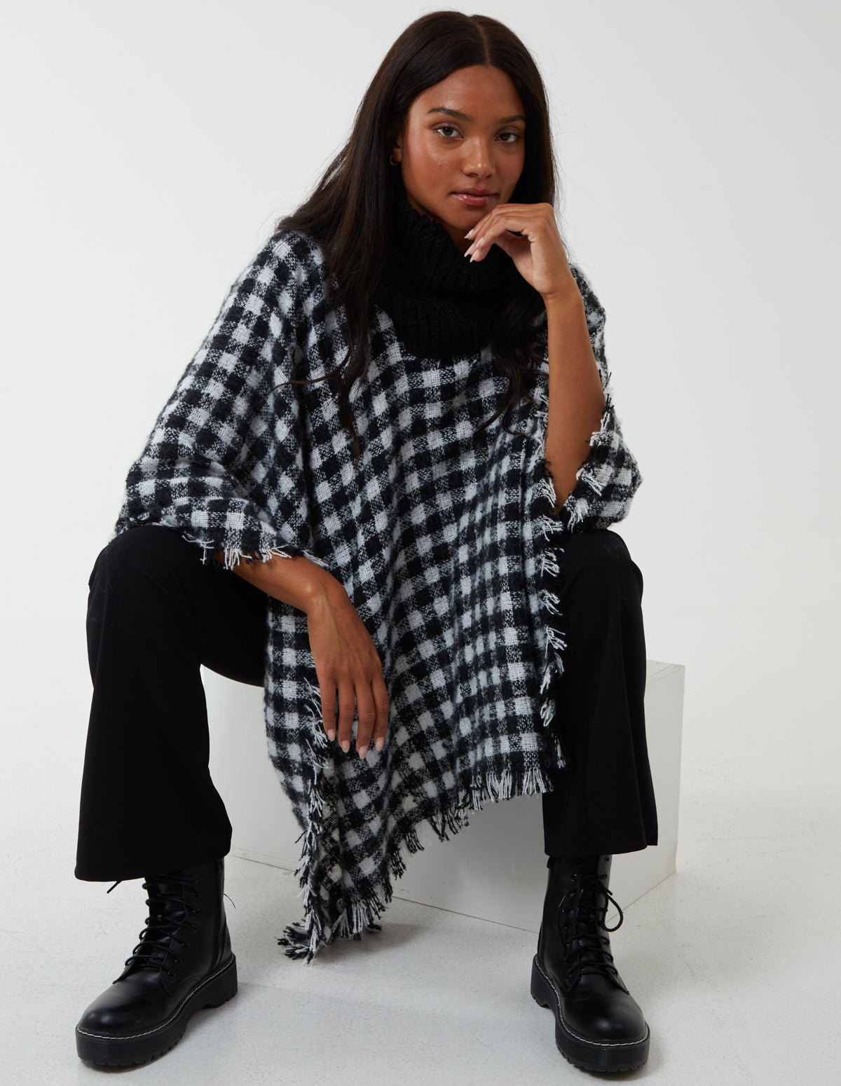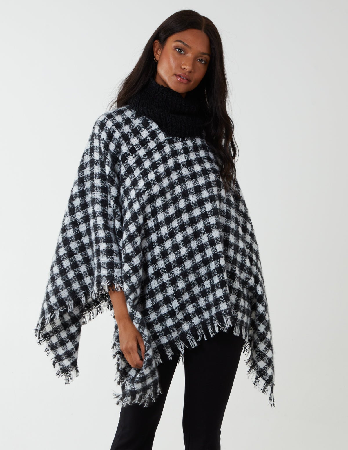 Stay warm and chic wearing this knitted poncho. It’s a versatile and cosy piece that you’ll be reaching for time and time again.