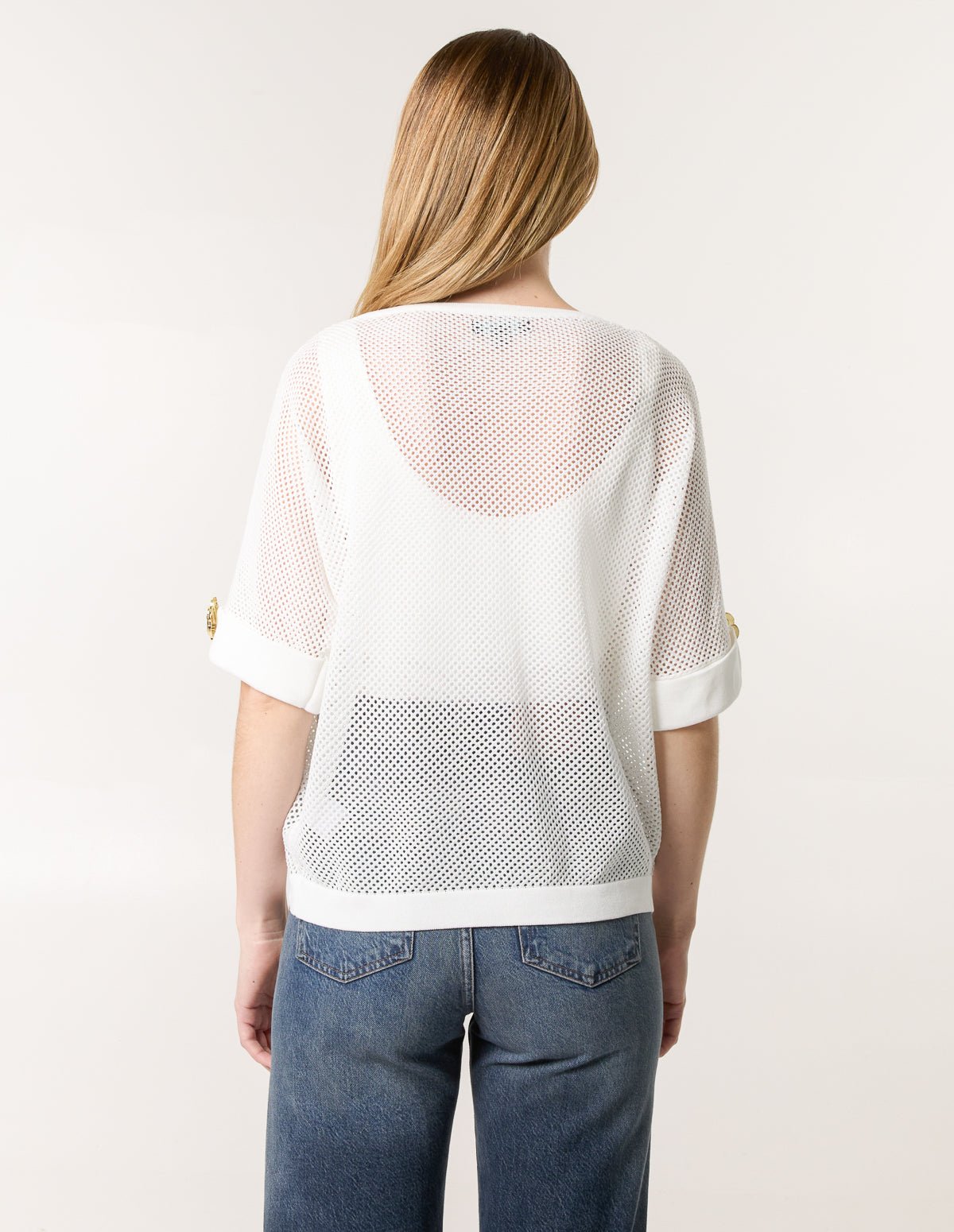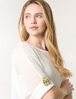 This crochet top is the perfect throw-on piece this season! With is cute gold flower detailing on the sleeves. Team with coloured denim jeans and gold sandals and accessories for the ultimate outfit!