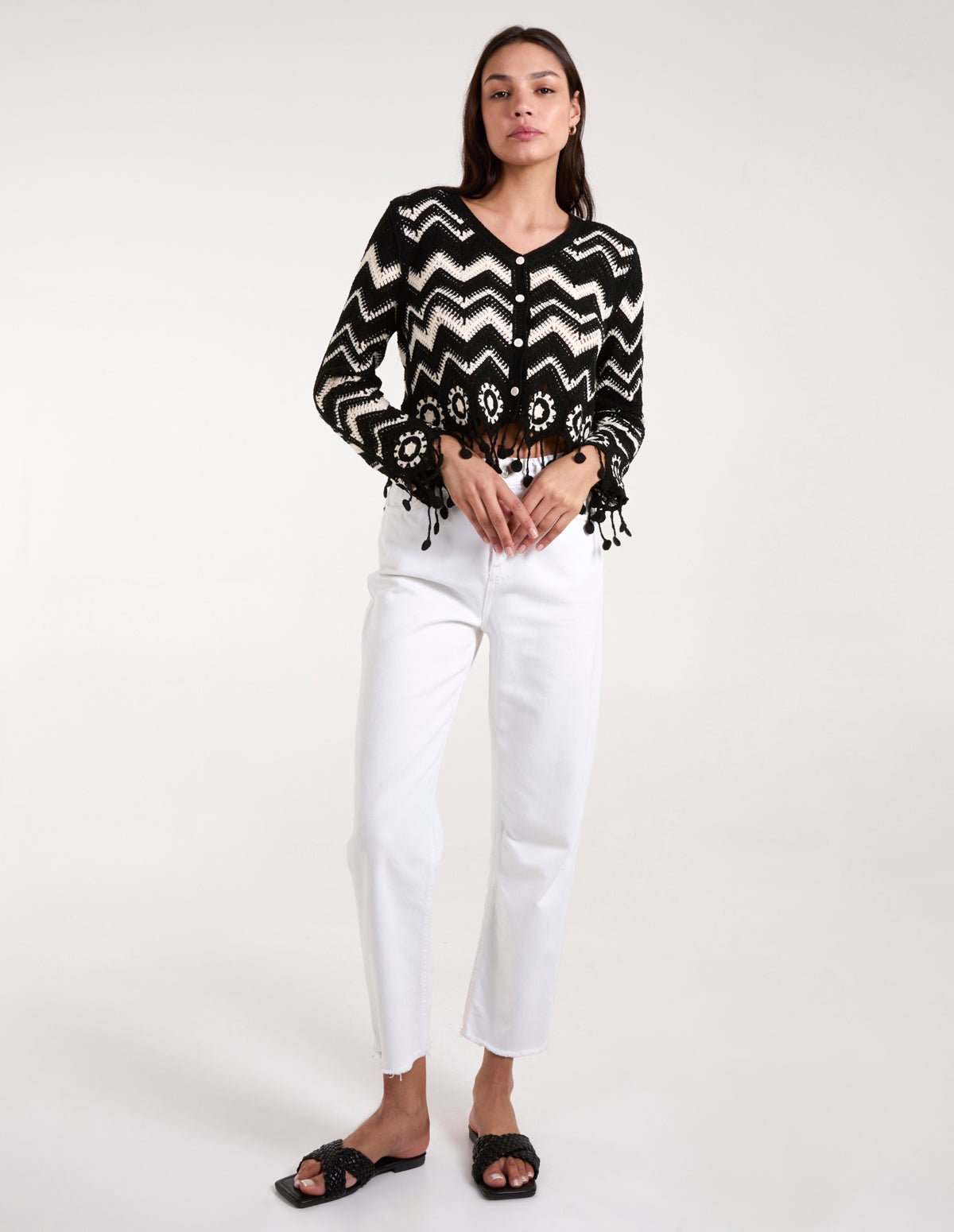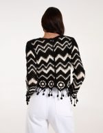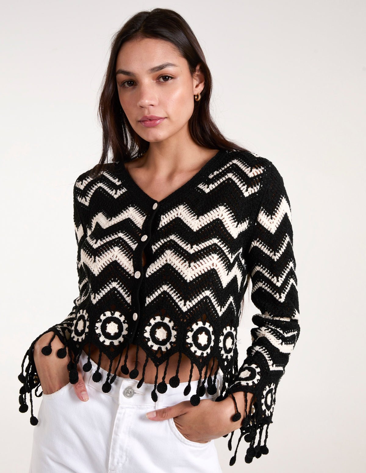 Crochet Zig Zag Tassel Detailed Button Front Cardigan