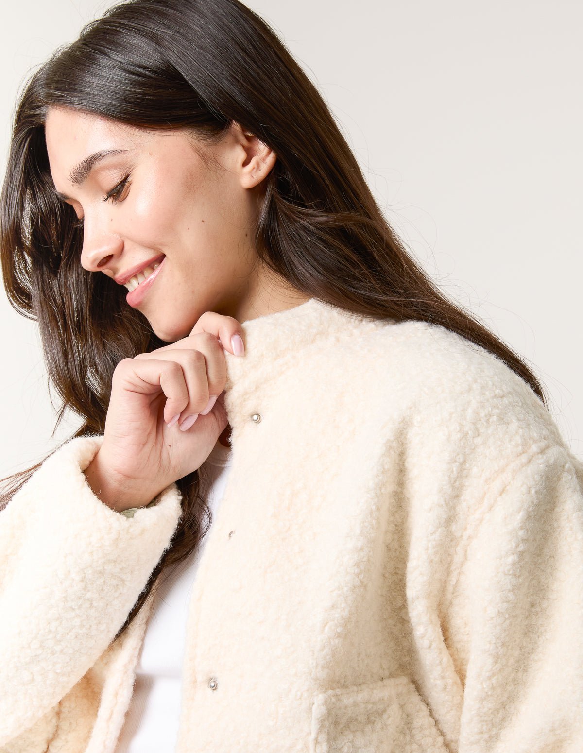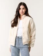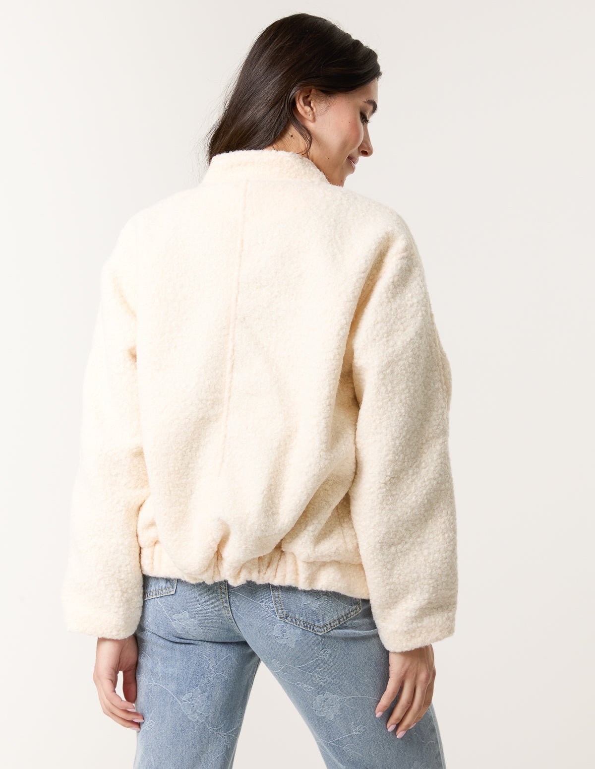A cute and cosy shearling bomber jacket. The ultimate layering piece as we move into Spring/ Summer. Providing nothing but warmth and style.Â