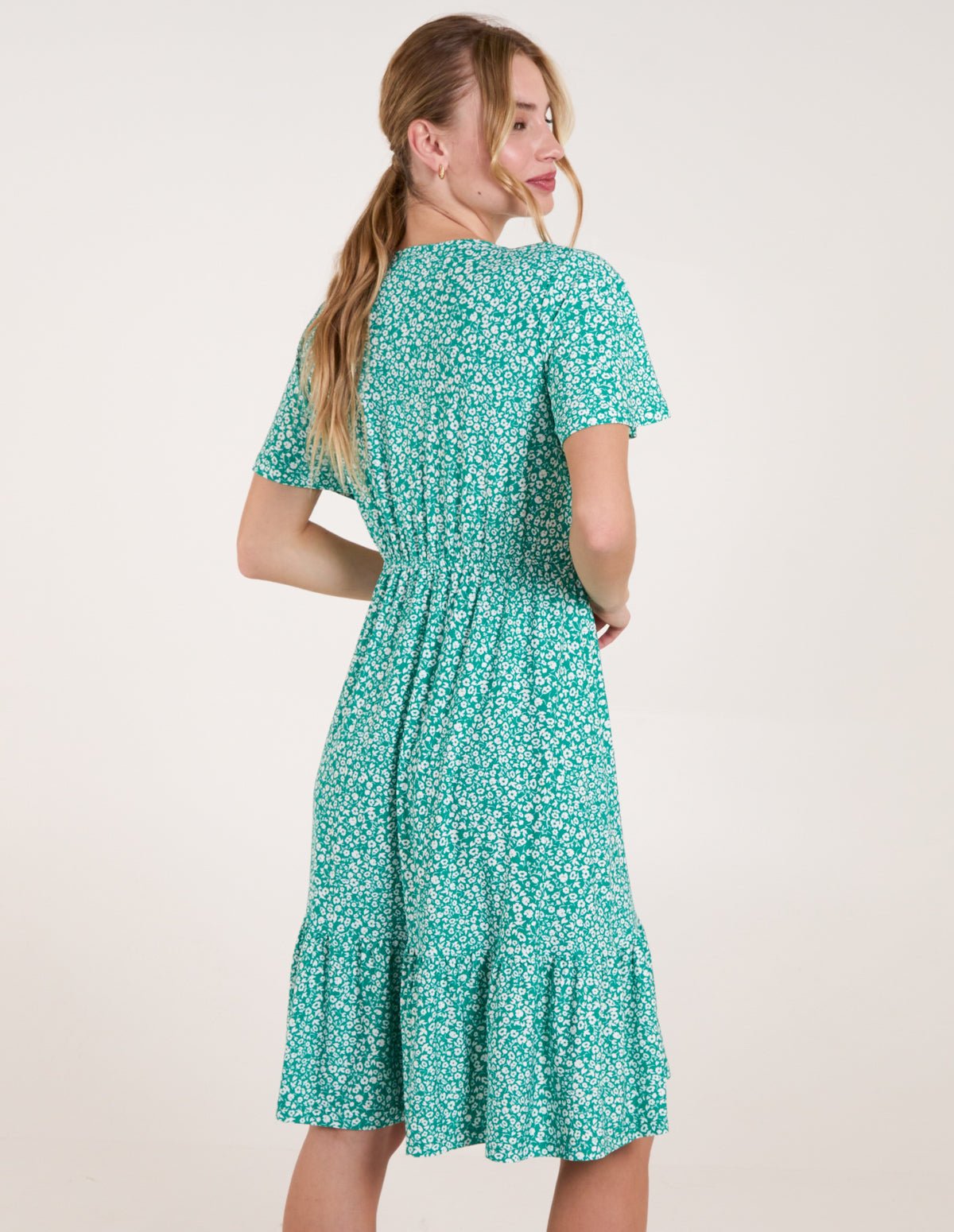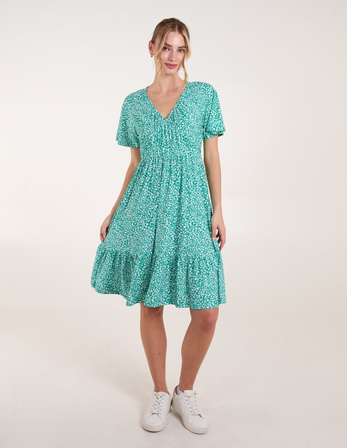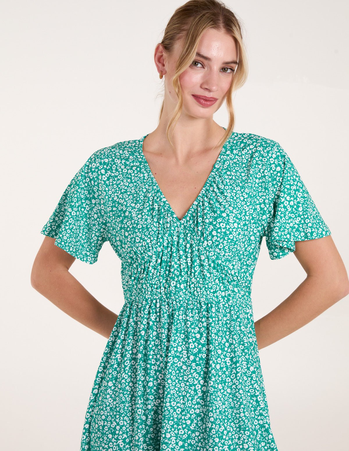 Ditsy Printed Angel Sleeve Elasticated V Neck Dress