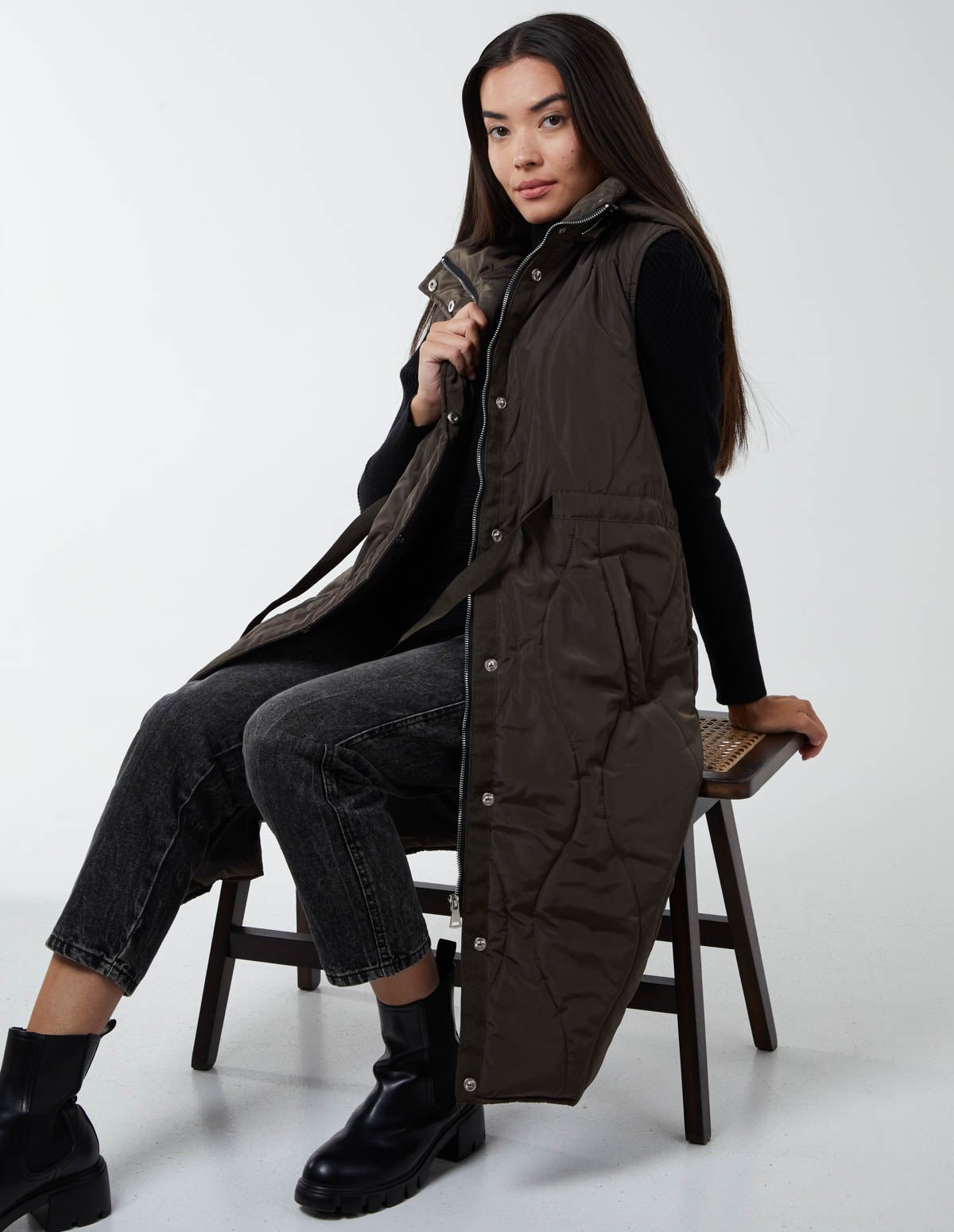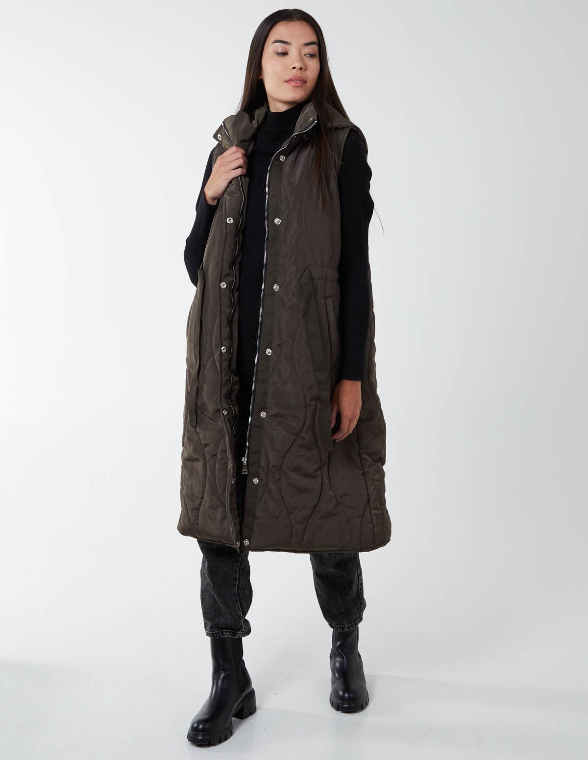 Whether you are taking a walk in the park, or going to work, the Onion Quilted Gilet won’t restrict you from any activity. Designed with a waist belt to hug your body and perfectly suit you, and a removable hoodie, match this gilet with a sweater and ankle boots.