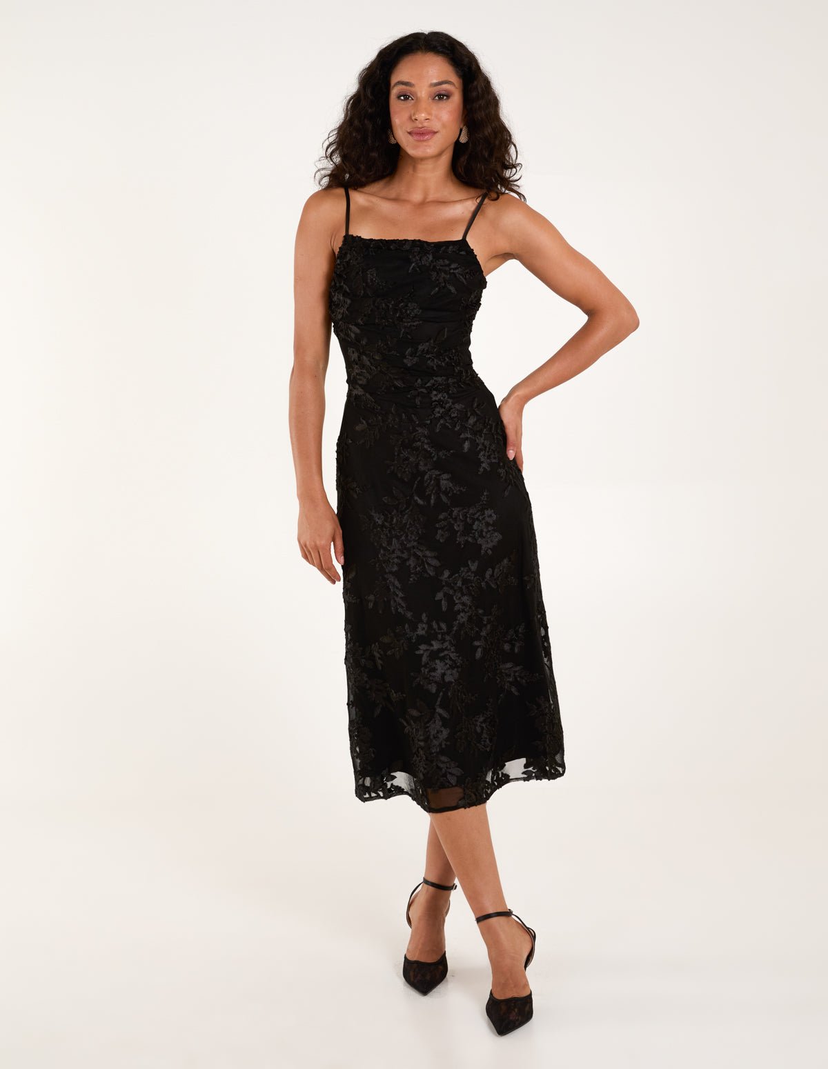You can always rely on a little black dress for a party occasion. This cami midi dress provides sophistication and elegancy. Team with a red lip and silver heels and accessories.