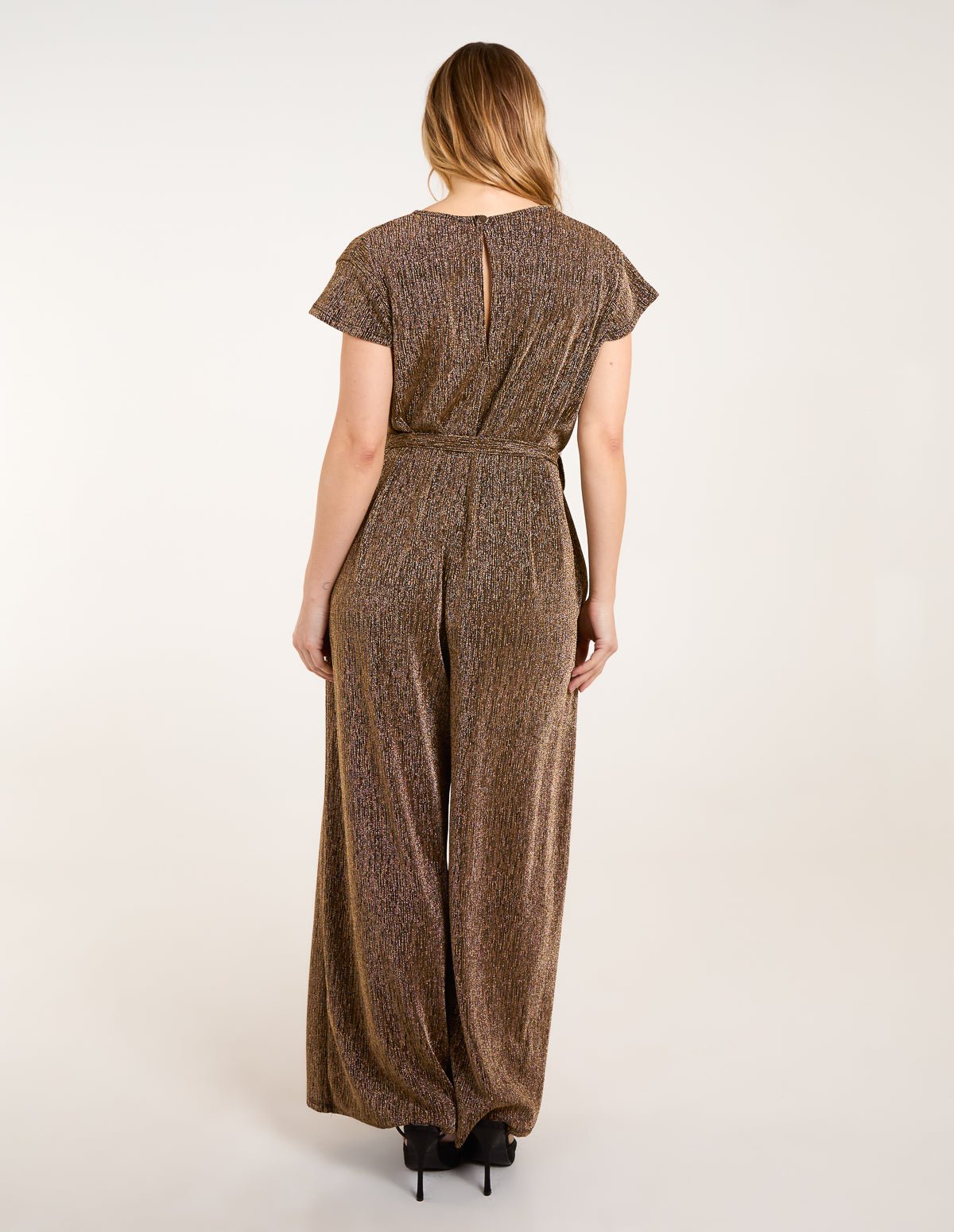 A one sized metallic wide leg jumpsuit that can fit from sizes 8-16, with it’s adjustable belt. This option can adjust to fit all kinds of sizes. Teamed with black heels and a swipe of red lipstick ensure to be party ready. Â Â