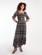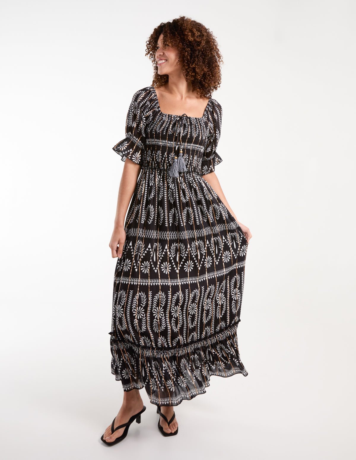 Staying comfy has never looked quite this good. This cheese cloth midi dress with is metallic Aztec print, and tassel front, ensure to turn heads this summer. Team with gold sandals and your fave sunnies and turn the temperature up.