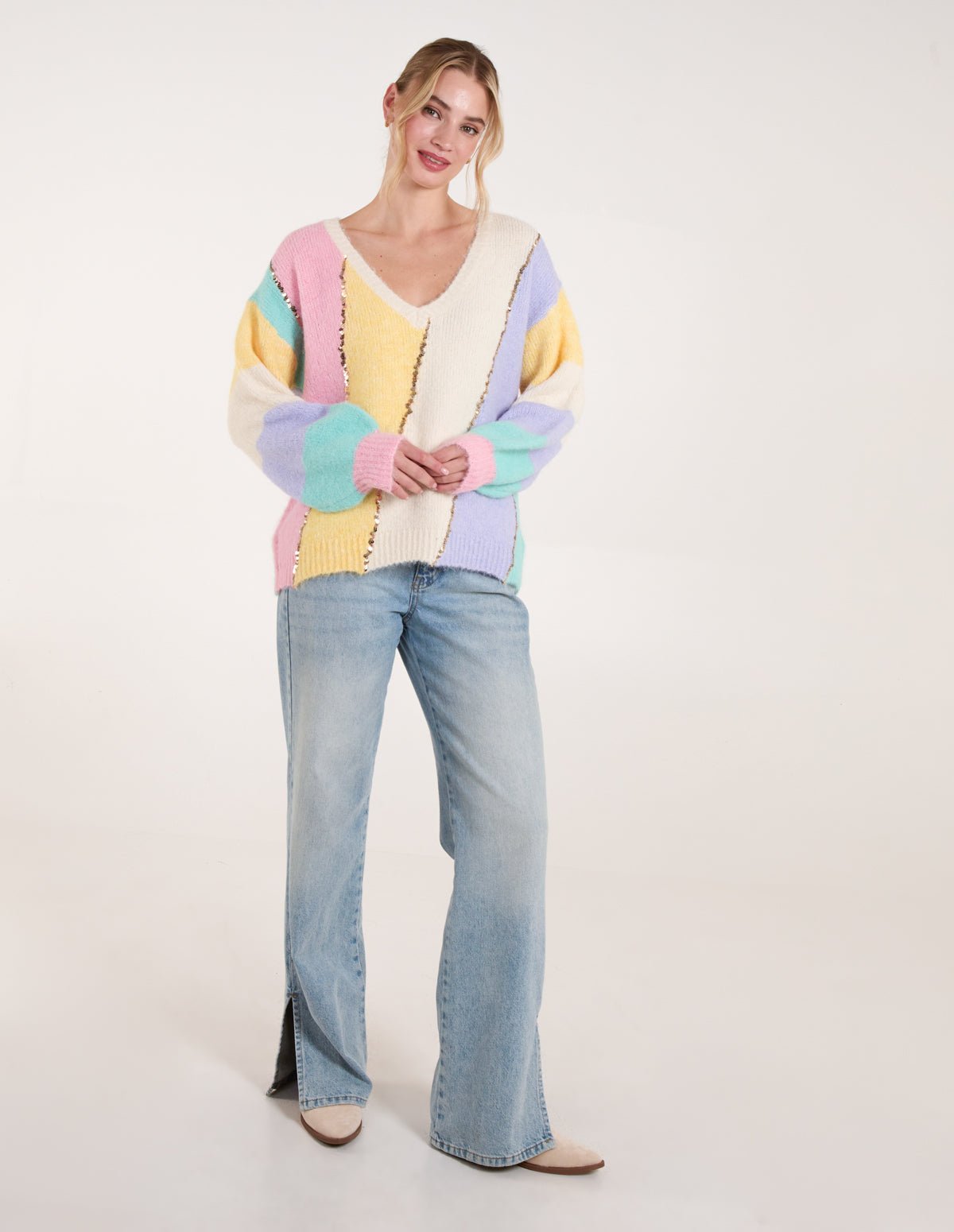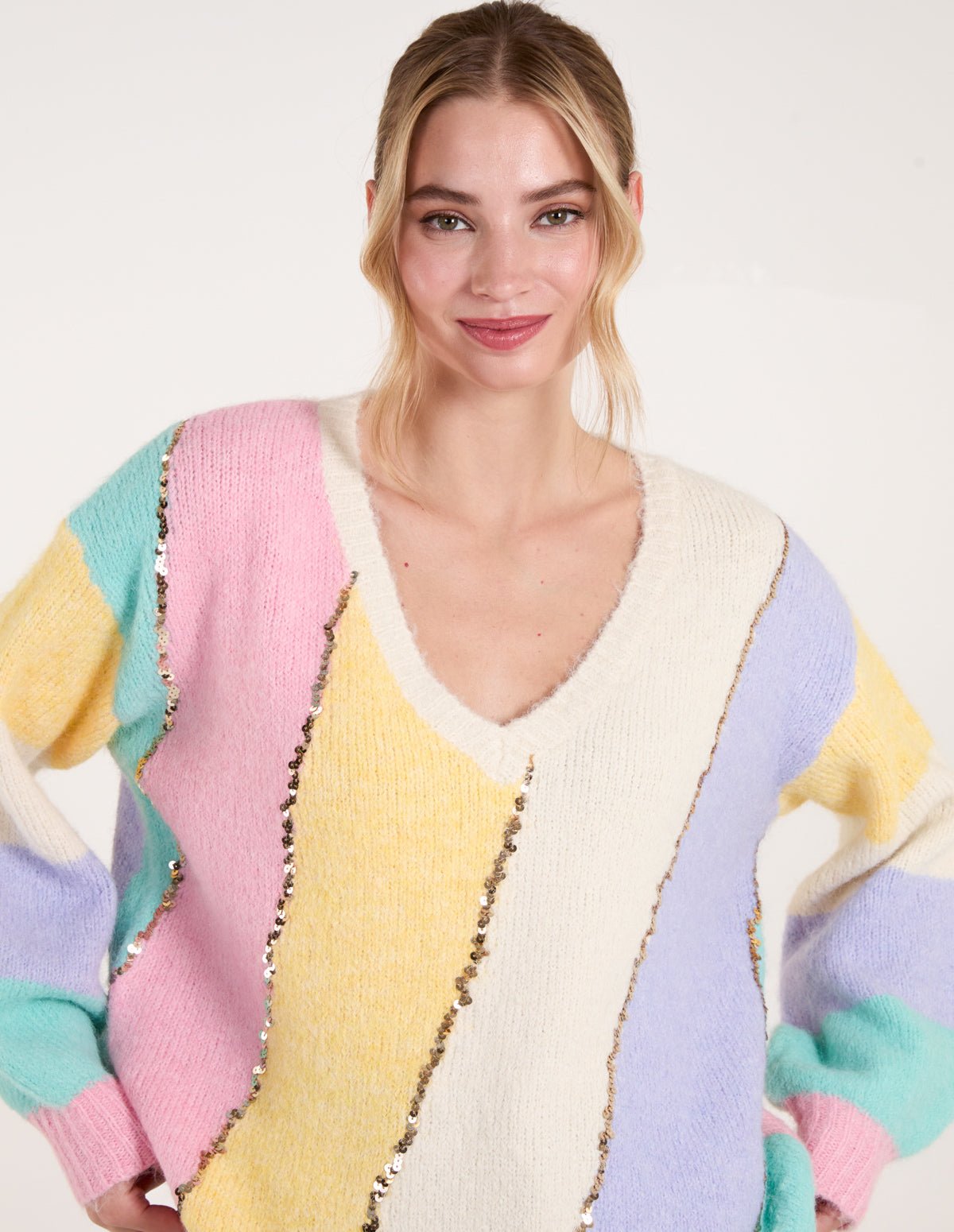 A fun, bright option that screams spring! With it’s pastel shades, and sequin detailing, this will be a perfect layering option for spring.