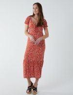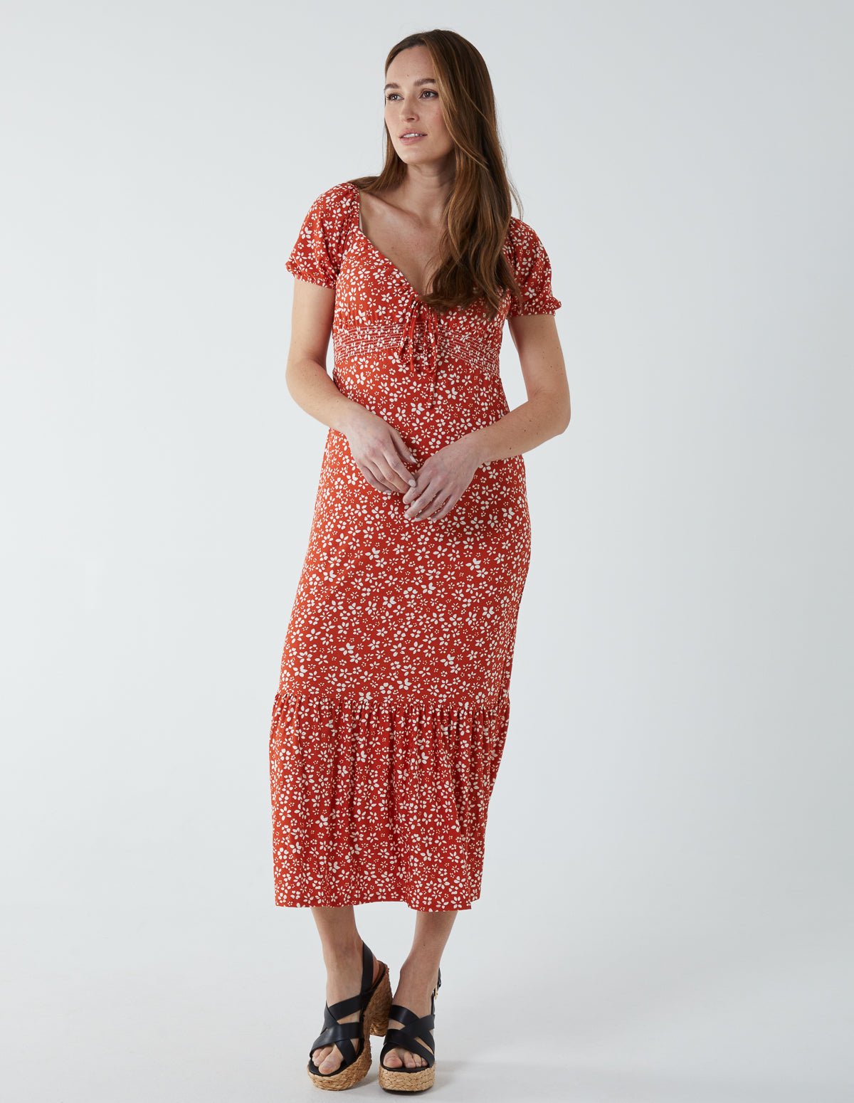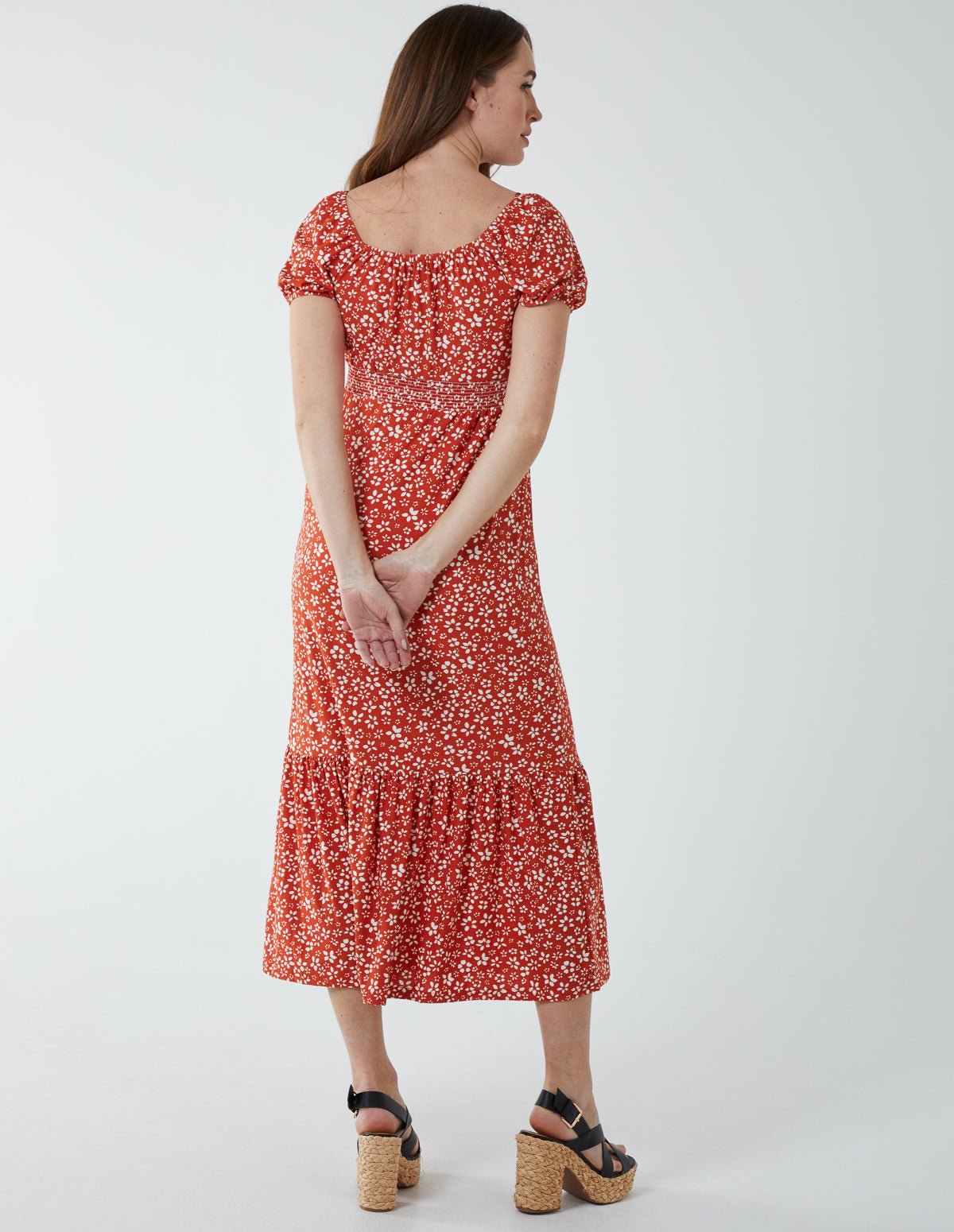 Shirred Milkmaid Sweetheart Midi Dress