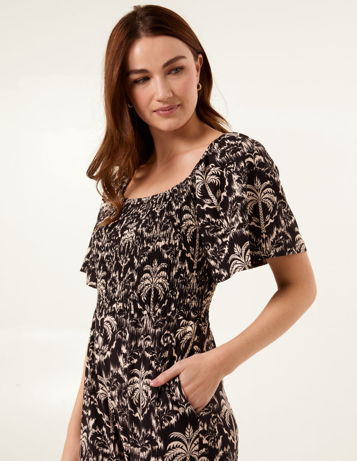 Palm Tree Print Square Neck Shirred Jumpsuit