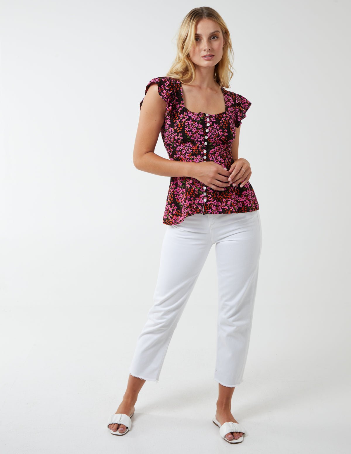 Stand out from the crowd with this cute peplum top! Floral print and frill short sleeve will add sophisticated look to you office outfit. Match with high state white skirt and summer high heels. Â
