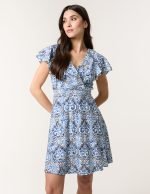 Printed Frill Sleeve Wrap Front Belted Waist Dress