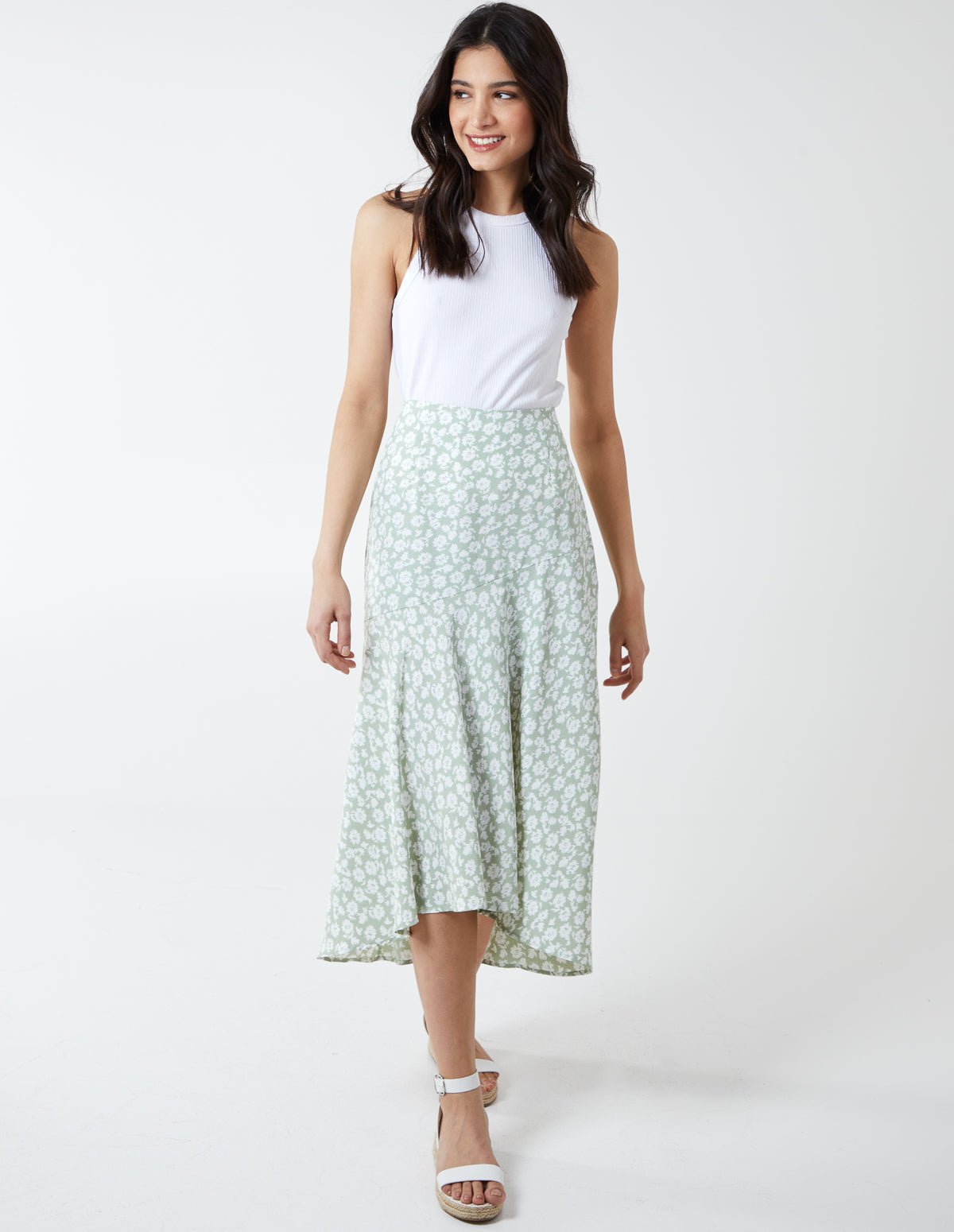 Get ready for summer with this classic asymmetric midi. Beautiful floral prints this skirt will brighten up any occasion with the high low hem drop keeping you look fresh and on trend. Compliment with white top and pair of sandals.