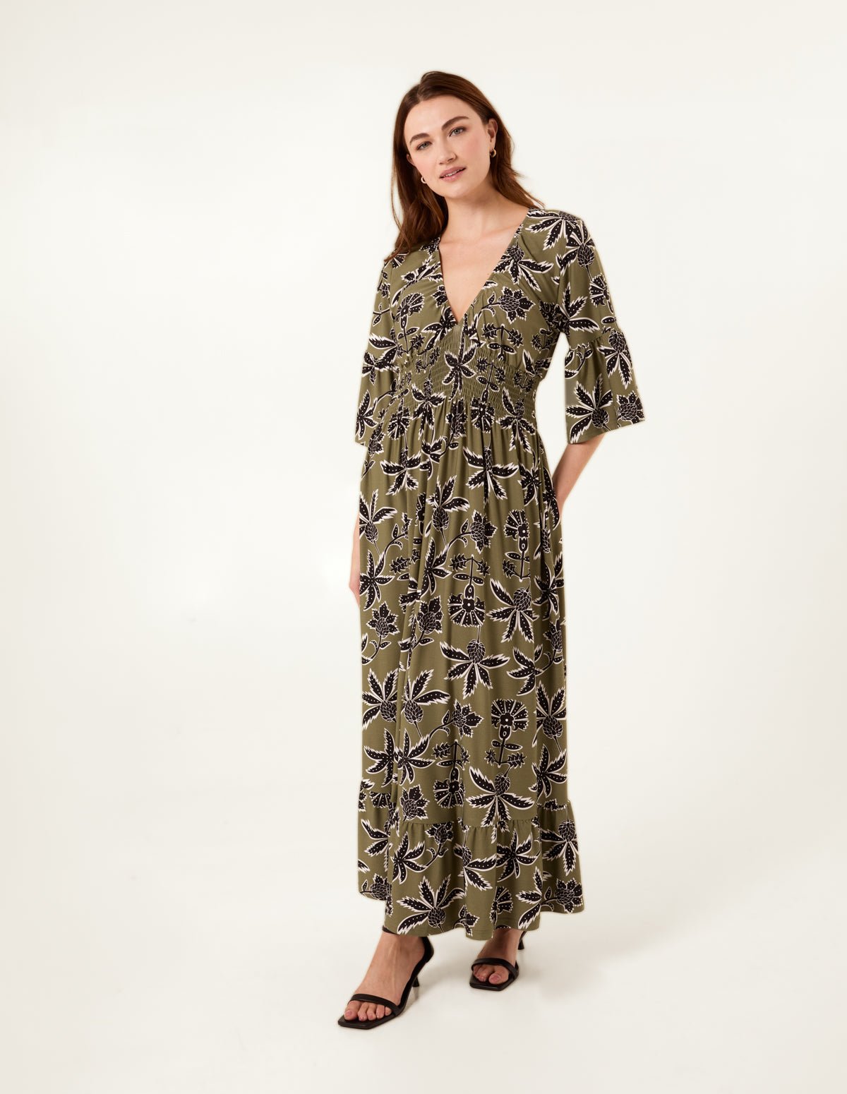 Tropical Print Elasticated Neck Shirred Waist Maxi Dress