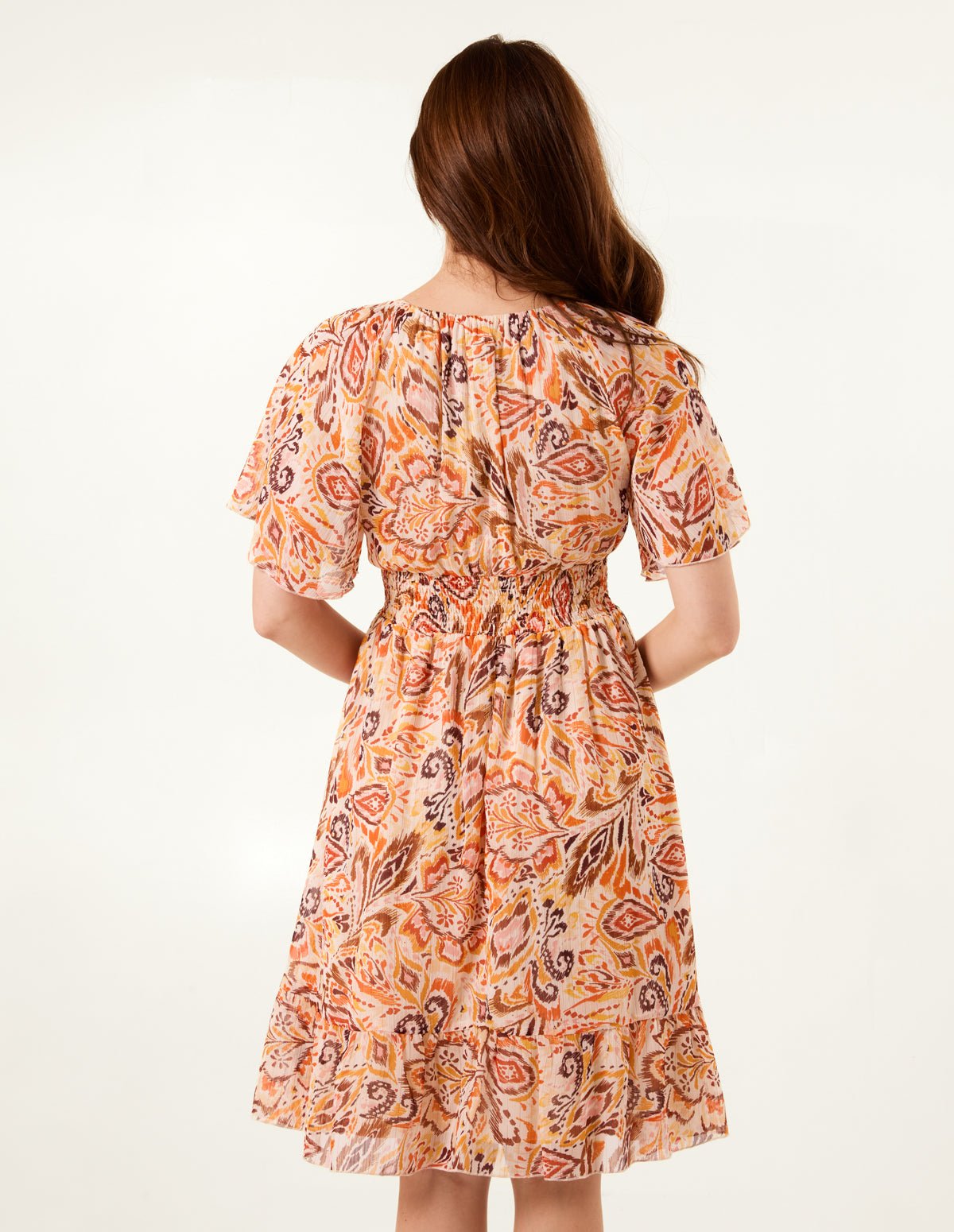 The dress that has it all, front it’s bold print to it’s summer time shades, team this midi with gold sandals and accessories.