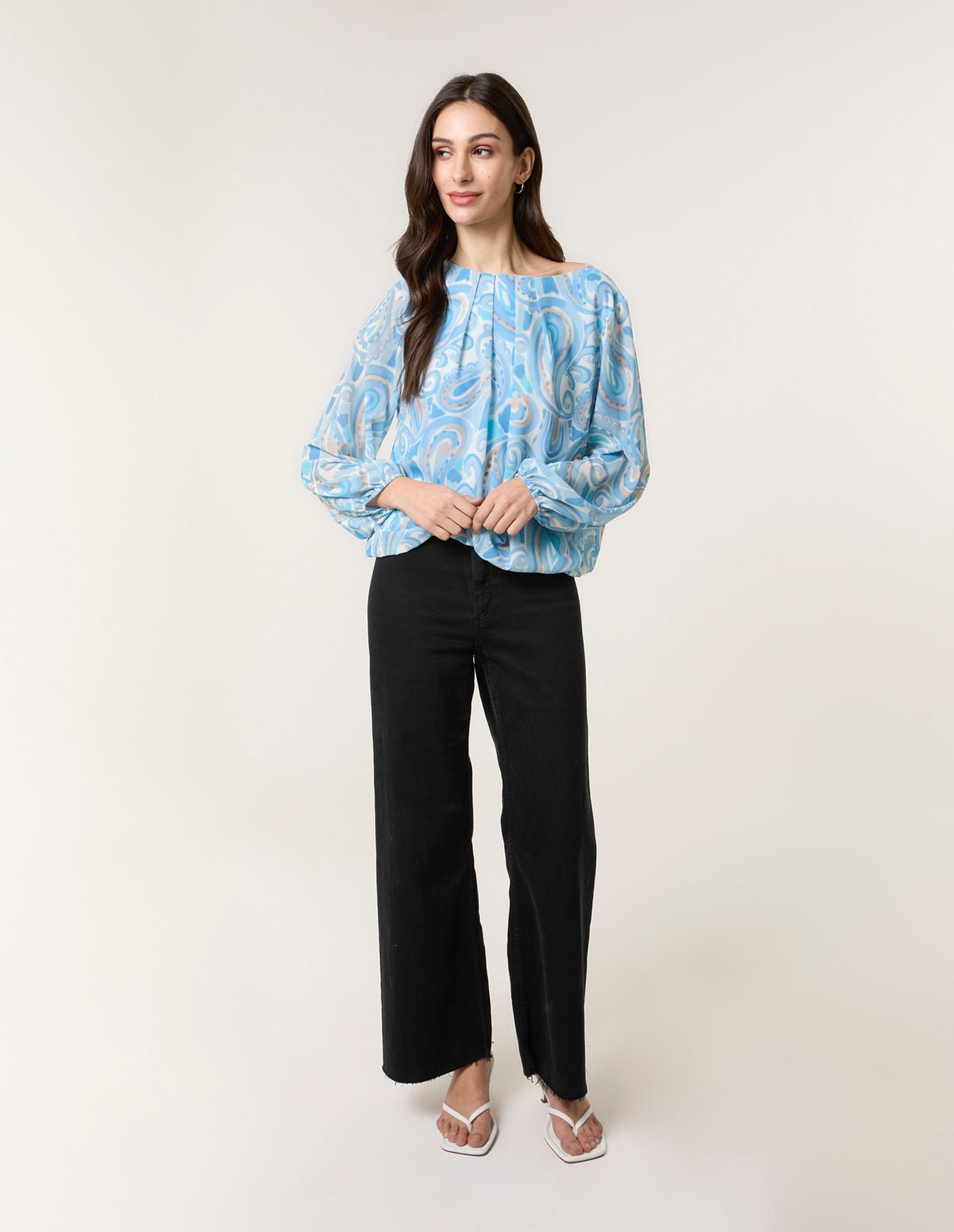 A fun option for when the weather begins to warm up! Team this paisley, watercolour blouse with white denim trousers and sandals. Â Â Â