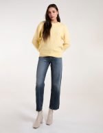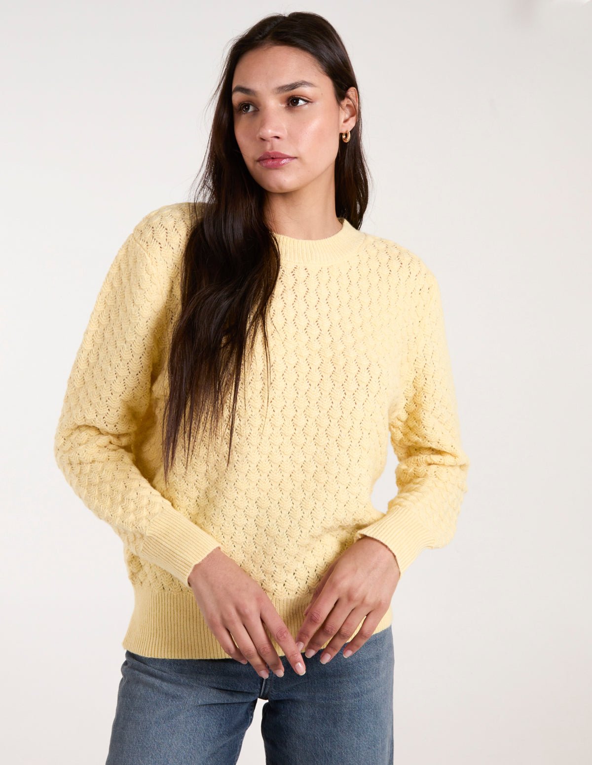 Opt for a lightweight pastel piece this spring. This cute and cosy thin textured jumper is providing nothing but spring vibes. Team with mom jeans and beige pumps. Â Â